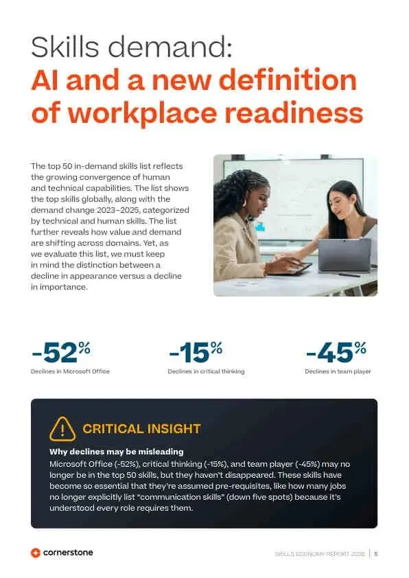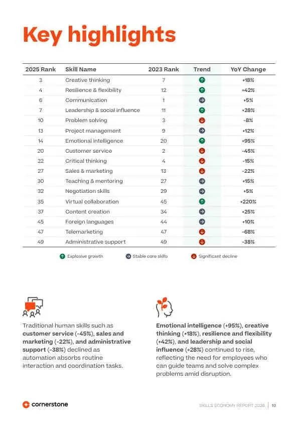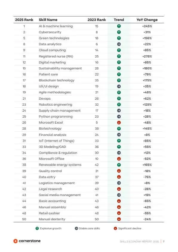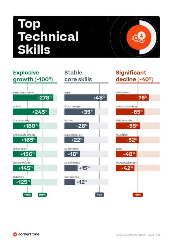 - “消失”的技能≠不重要: 如Microsoft Office(-52%)、批判性思维(-15%)等未入Top 50,是因为它们已成为默认前提,如同“沟通能力”。