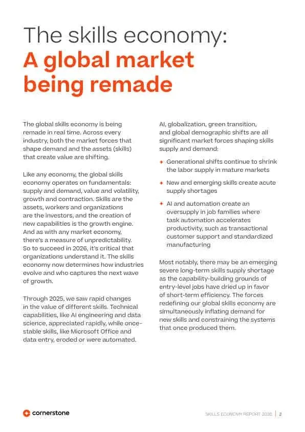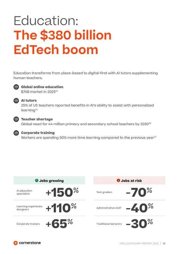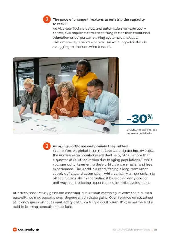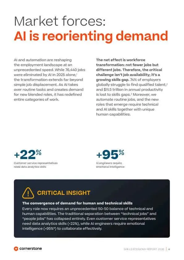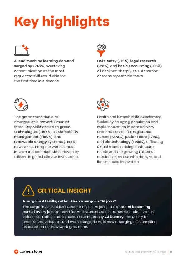 全球技能经济正经历一场由AI、自动化、绿色转型和人口结构变化共同驱动的深刻重构。这场变革的核心特征是“技术能力”与“人类能力”的空前融合,以及由此产生的巨大技能供需错配。报告警告,短期效率提升(如自动化)正在侵蚀长期能力建设的基础(如入门级岗位),若不采取系统性干预,将导致严重的“能力危机”。未来的成功属于那些能将技能视为核心增长资产,并构建韧性学习体系的组织和个人。