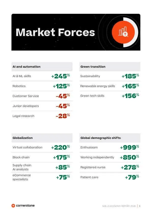 - 人口结构变化: 成熟市场劳动力萎缩,加剧技能短缺。