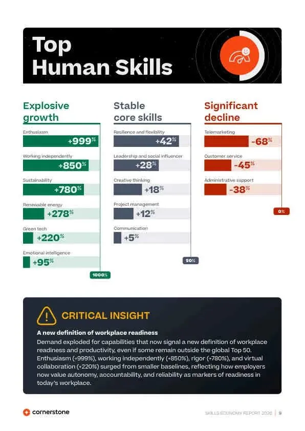 - 爆炸性增长(>100%) AI/ML(+245%)、注册护士(+278%)、可持续发展(+180%)、热情(+999%)、独立工作(+850%)。