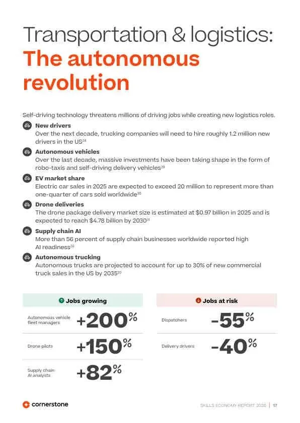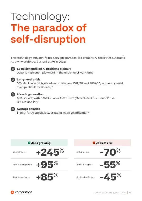 - 科技业: 面临“自我颠覆”悖论,AI工具自动化自身工作,导致入门级岗位锐减50%,但AI工程师需求激增245%。