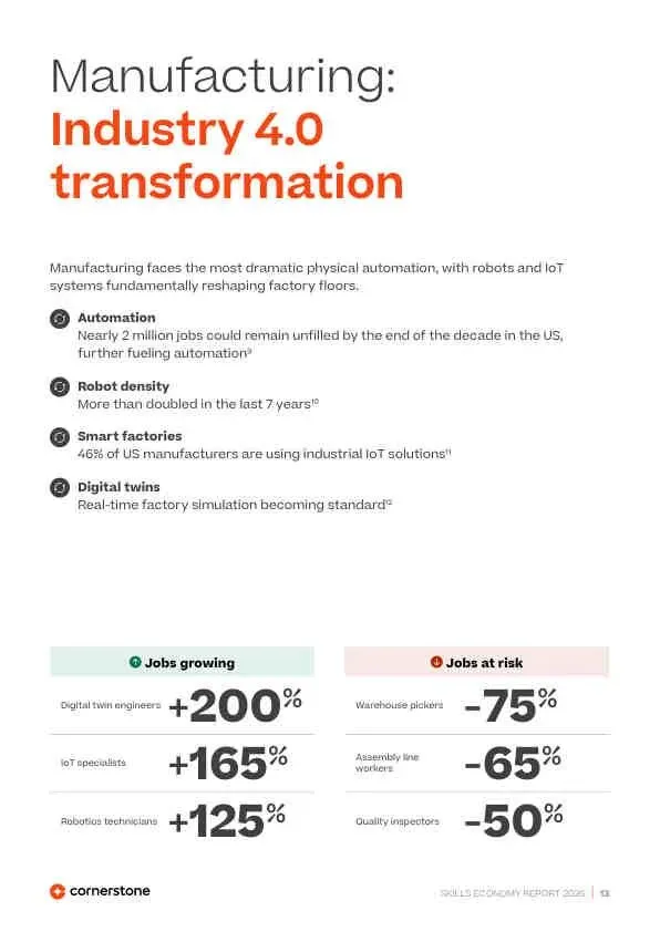 - 制造业: “工业4.0”加速,机器人技师(+125%)、数字孪生工程师(+200%)需求旺盛,而流水线工人(-65%)被取代。