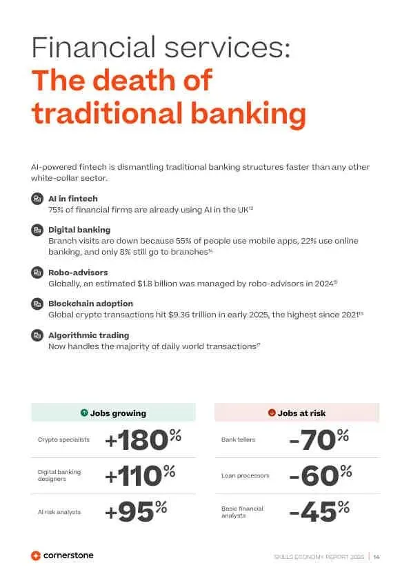 - 金融业: “传统银行之死”,加密专家(+180%)、AI风控分析师(+95%)崛起,柜员(-70%)、贷款处理员(-60%)被淘汰。