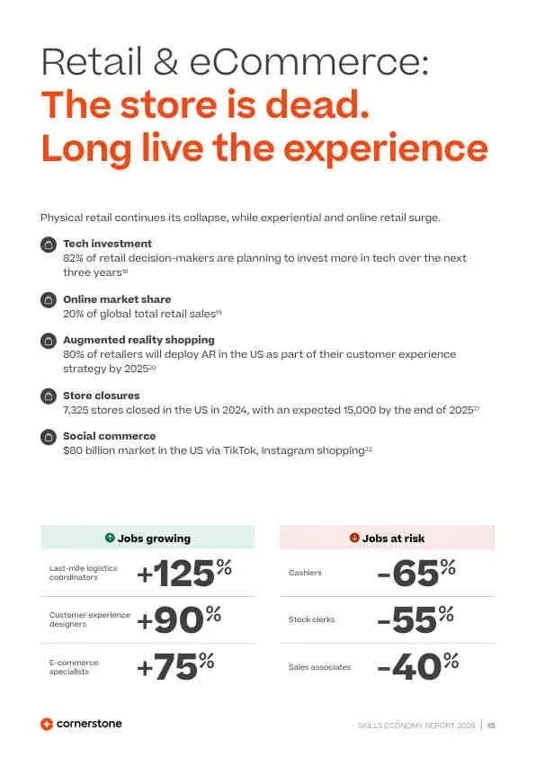 - 零售业: “实体店已死”,电商专家(+75%)、客户体验设计师(+90%)吃香,收银员(-65%)、理货员(-55%)减少。