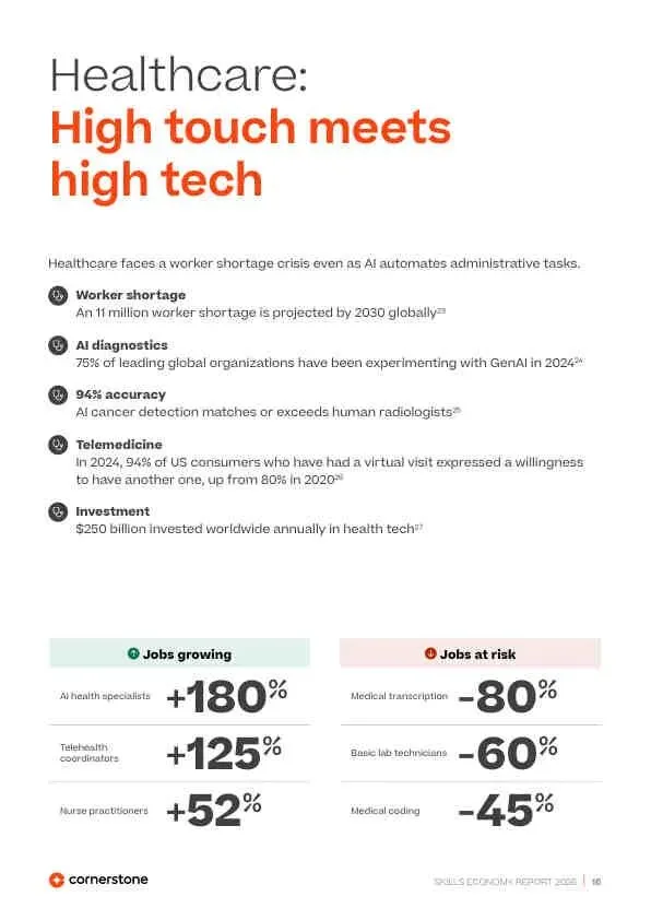 - 医疗健康: “高接触+高科技”融合,护士(+278%)、远程医疗协调员(+125%)紧缺,而医疗转录(-80%)被AI替代。