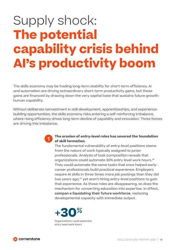 - 入门级岗位枯竭: 30%的入门级工作时长可被自动化,这切断了新人将教育转化为经验的关键路径。