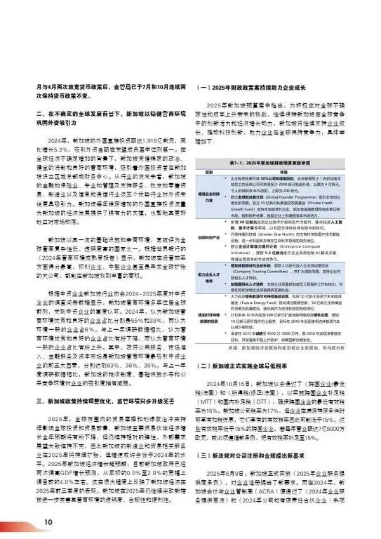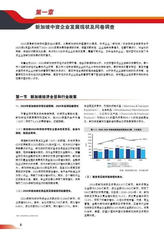 2025年是中新建交35周年。35年来,双边务实合作不断推进、成果丰硕,全方位高质量的前瞻性伙伴关系不断深化。自2013年起,中国已连续12年是新加坡最大贸易伙伴国。截至2025年9月,中新双边贸易额累计超过1.8万亿美元。双向投资方面,新加坡累计对华直接投资超过2.4万亿美元,30年间直接投资年均复合增长率高达18.3%。2022年新加坡首次超越日本,成为中国累计最大外资来源国。中新两国“一带一路”、科技创新、数字经济、可持续发展、金融以及人文等领域务实合作不断深化。为深入了解中资企业在新发展情况,助力中资企业高质量发展,中资企业(新加坡)协会研究咨询委员会主导,与毕马威新加坡合作,对新加坡中资企业进行调研和访谈,编制形成《新加坡中资企业年度发展报告(2024-2025)》。报告遵循“调研数据+行业剖析+案例解析”的方法论,一方面对2025年新加坡宏观经济走势和产业政策进行系统回顾,结合中资企业问卷调查总结、线上线下访谈情况,为在新中资企业发展画像。另一方面深入分析新加坡及区域市场环境,重点研判主要行业发展趋势,纳入中资企业关于营商环境预期、经营及投资布局、战略调整方向等内容,系统性展望在新中资企业发展前景。以上资料均从网络公开资料收集整理而成,所有报告版权归原公司、机构所有!如有侵权请留言联系我们,我们将第一时间处理。