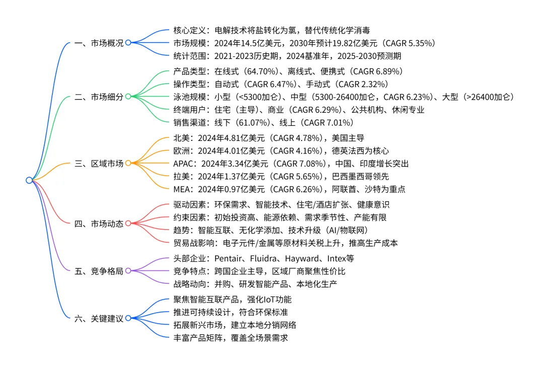 全球泳池盐氯发生器市场在 2024 年规模达 14.5 亿美元,预计 2030 年将增长至 19.82 亿美元,CAGR 为 5.35%,其中APAC 是增长最快的区域(CAGR 7.08%);市场以住宅端需求为主,产品类型上在线式占比最高(64.70%),操作类型中自动式增速领先(CAGR 6.47%);驱动因素包括环保需求提升、智能泳池系统普及、 hospitality 行业扩张等,同时面临初始投资高、能源依赖等约束,竞争格局呈现跨国企业主导 + 区域厂商补充的特点,贸易战对原材料成本和供应链产生一定影响。