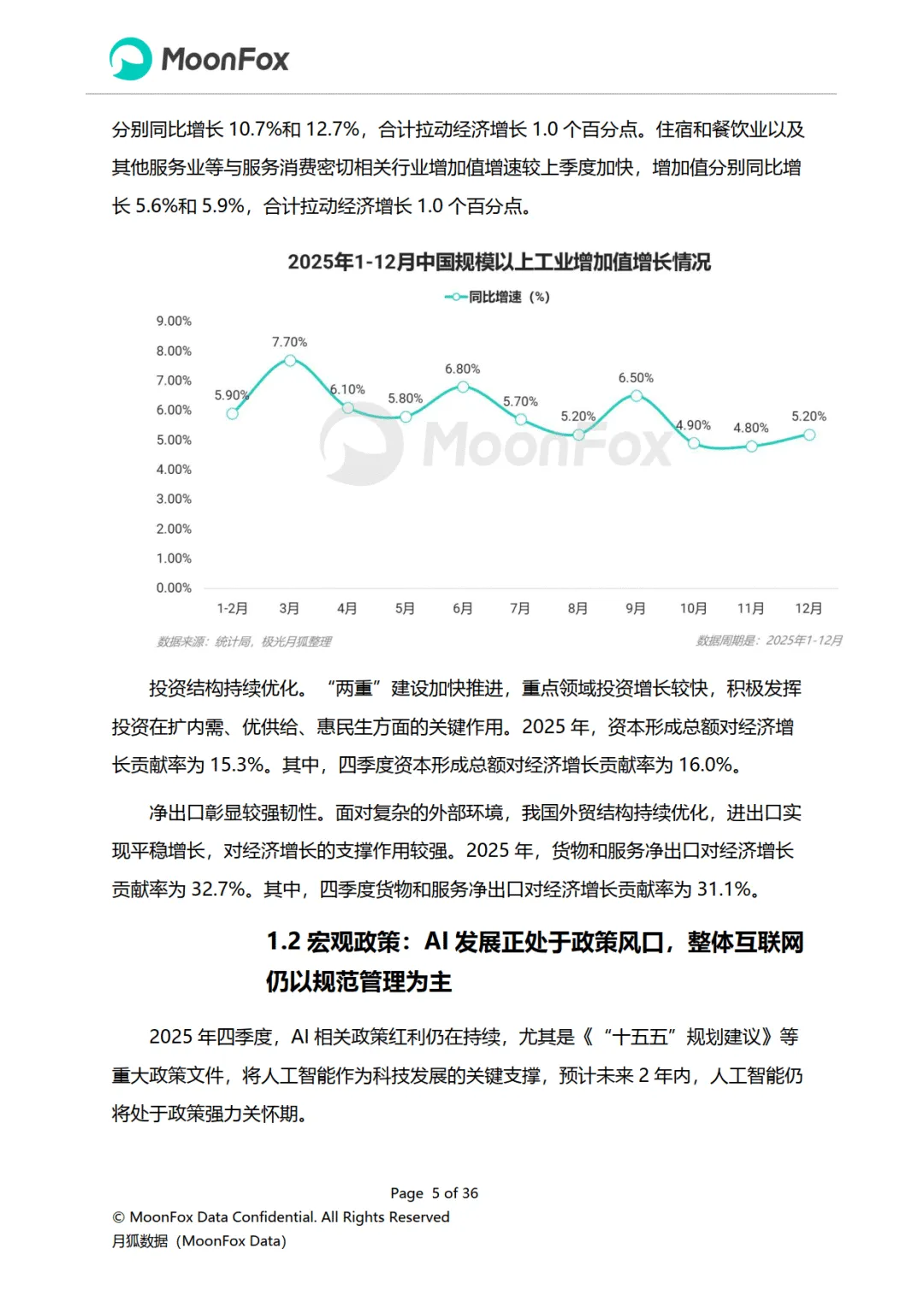2025 年 Q4 极光月狐移动互联网行业报告显示,我国全年 GDP 首破 140 万亿元、同比增 5.0%,四季度 GDP 同比增 4.5%,第三产业贡献率达 63.2%,消费、净出口成经济增长主要支撑。互联网行业在存量市场稳步发展,AI 成核心发展引擎,各细分领域呈现 “规范发展 + 创新升级” 双重特征,政策端则对 AI 给予强力扶持,对互联网行业强化合规监管。