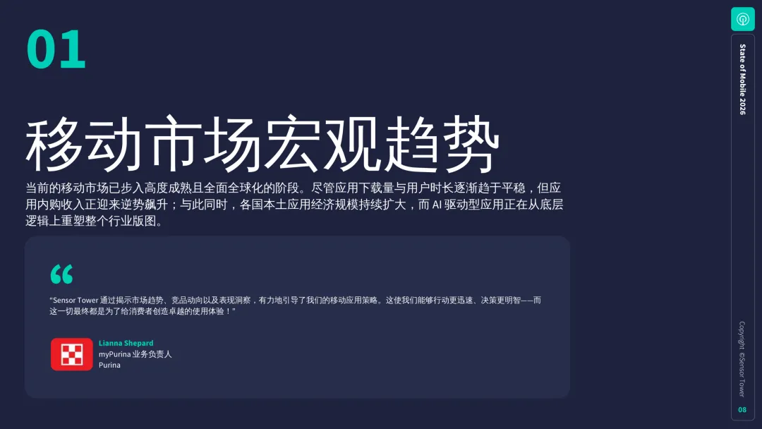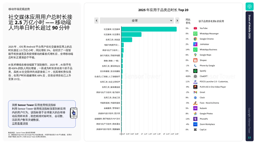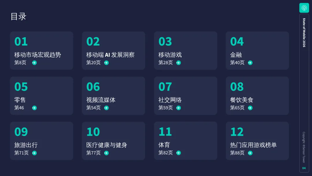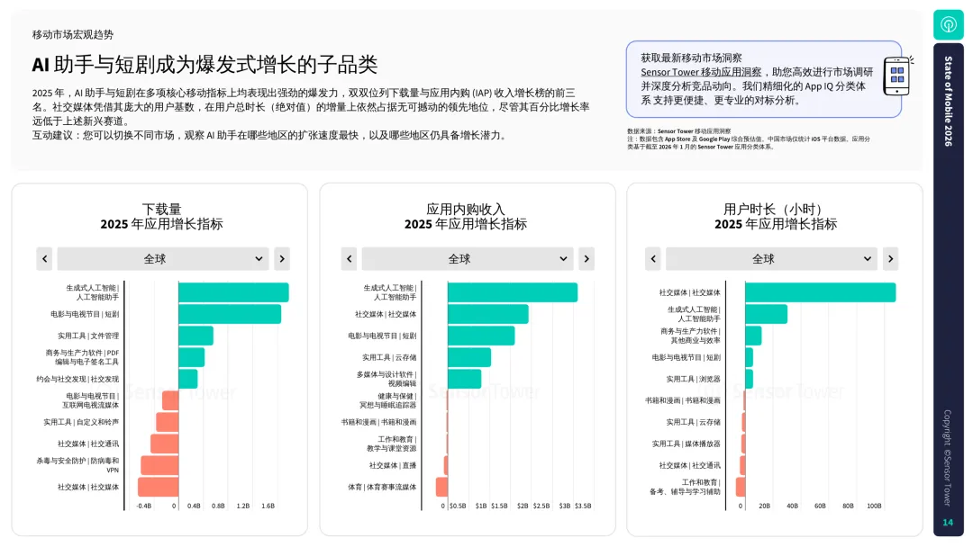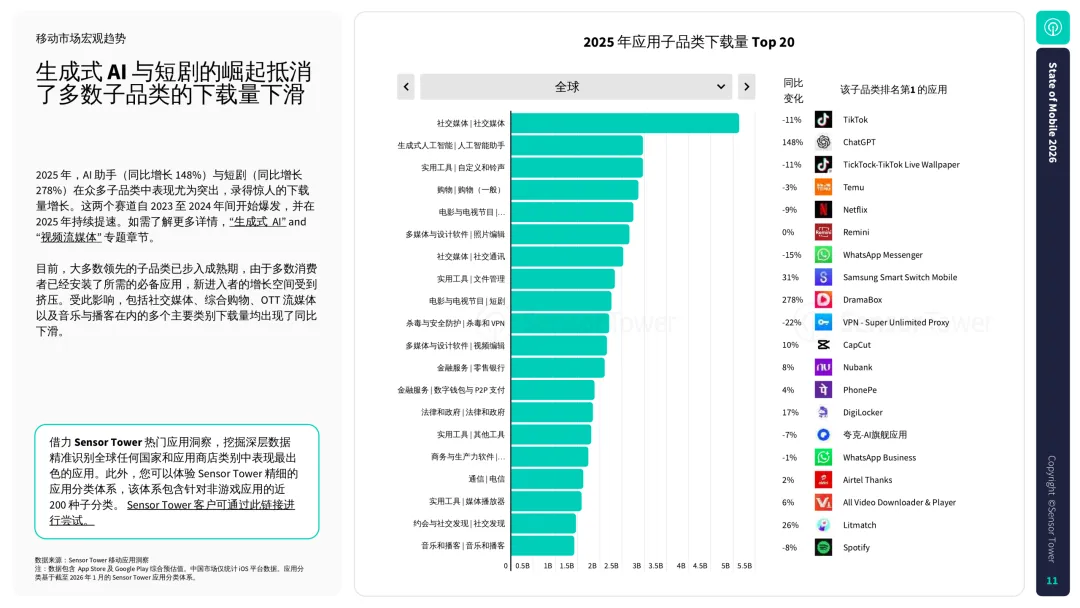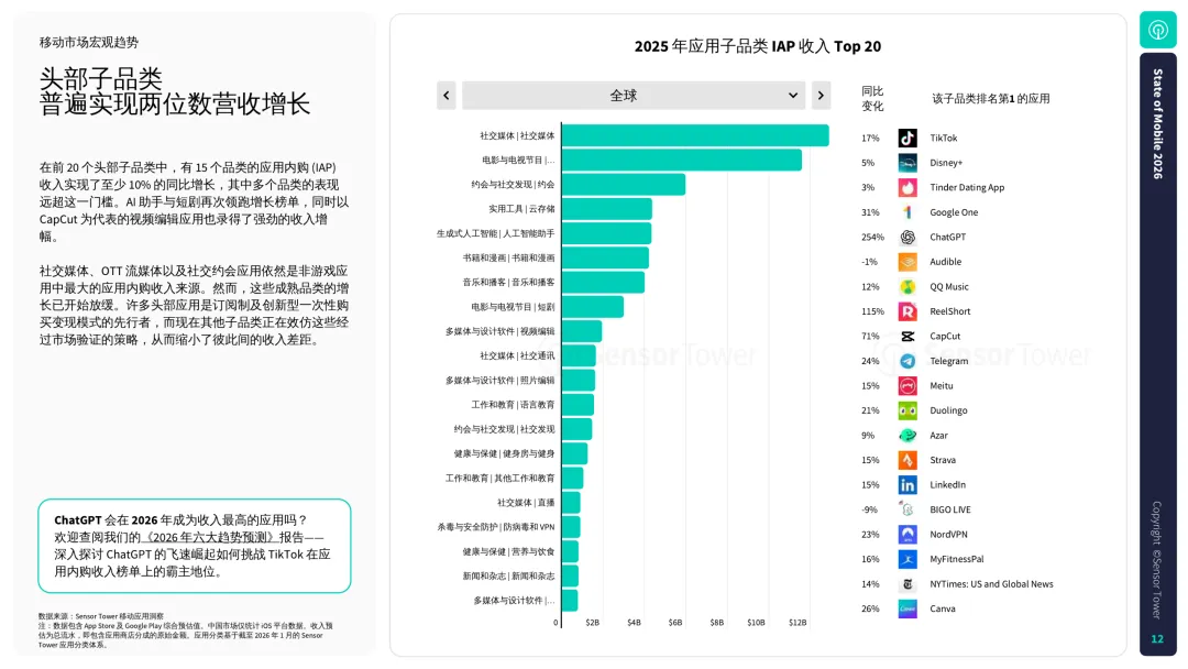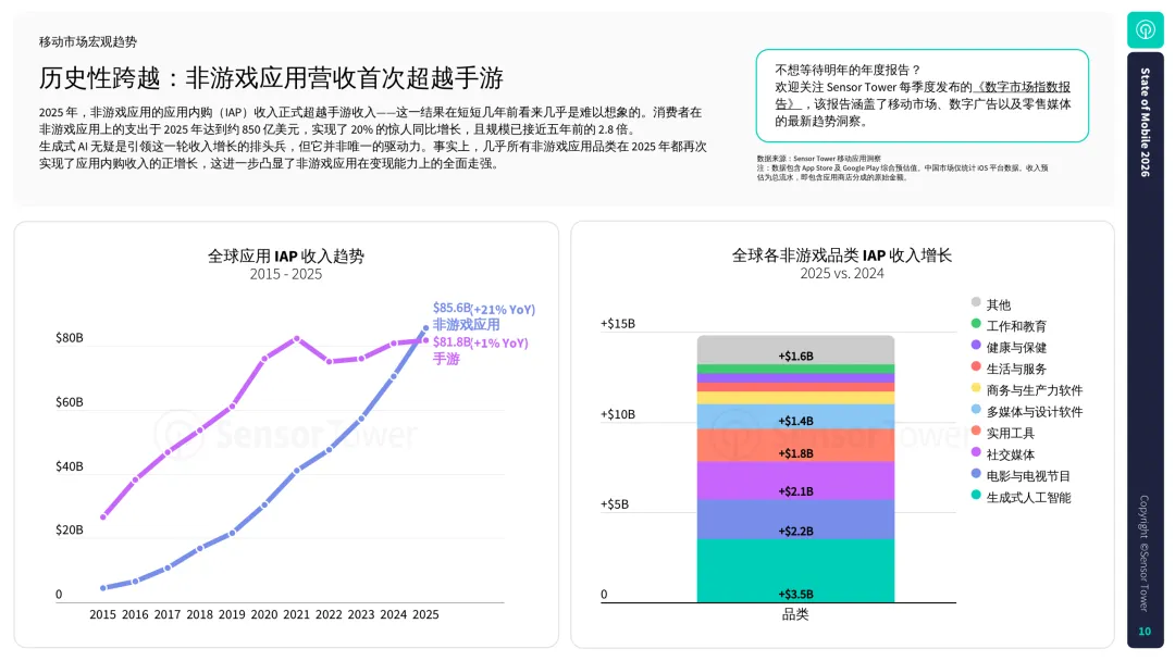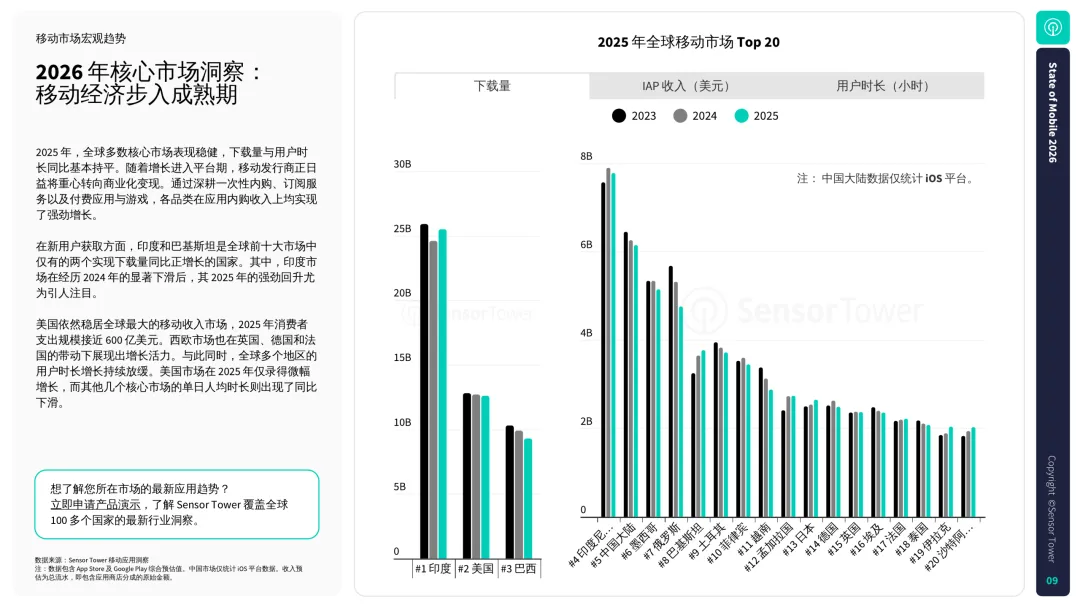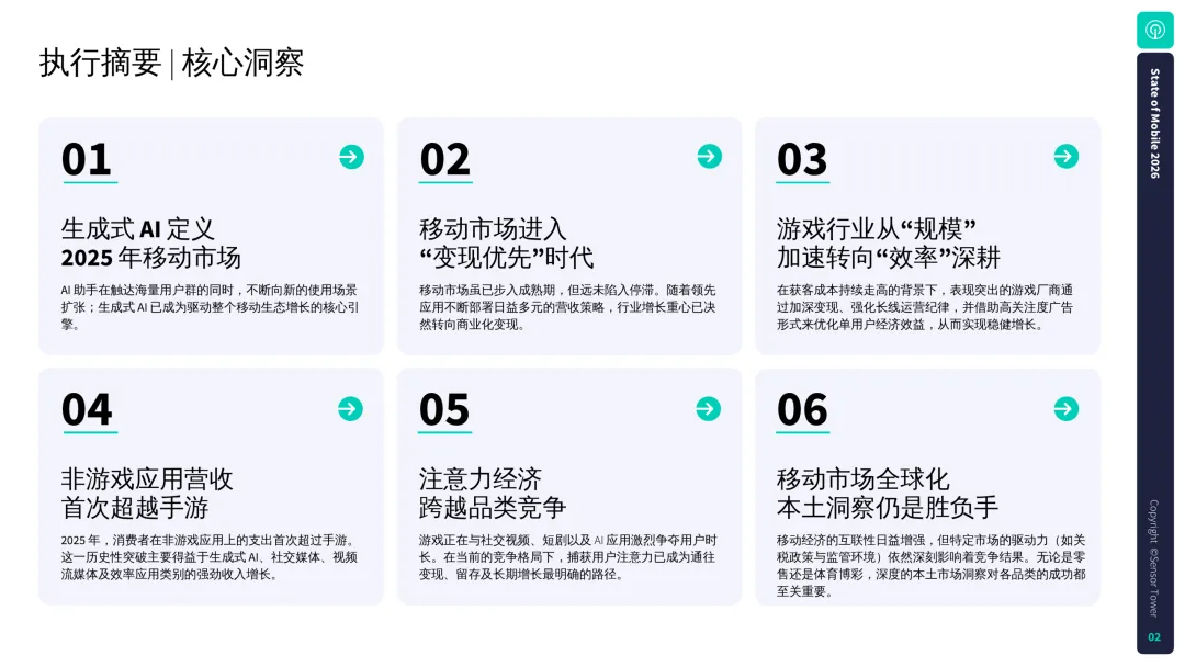 2026年移动市场报告揭示了当前行业发展的关键趋势与变化。生成式AI正成为推动整个移动生态增长的核心力量,其应用范围不断扩展,渗透到各类使用场景中。在这一背景下,游戏行业已从单纯追求用户规模转向更加注重变现效率和长期运营能力。领先厂商通过优化广告形式、加强用户留存以及深化商业化策略,实现了更稳定的增长。非游戏应用的收入首次超过手游,这标志着用户消费行为的转变。社交媒体、视频流媒体及效率工具等领域的强劲表现,反映出用户对内容与服务的需求正在多元化。同时,注意力经济成为竞争的关键,如何有效吸引并保持用户关注,直接影响到变现能力和市场地位。移动市场的全球化进程加快,但不同区域的市场特性依然显著。政策环境、税收制度及监管措施等因素,对本地市场的竞争格局产生深远影响。无论是在新兴领域还是传统品类,深入理解本土市场动态仍是成功的重要因素。移动市场虽已进入成熟阶段,但仍充满活力,持续展现出强大的增长潜力。