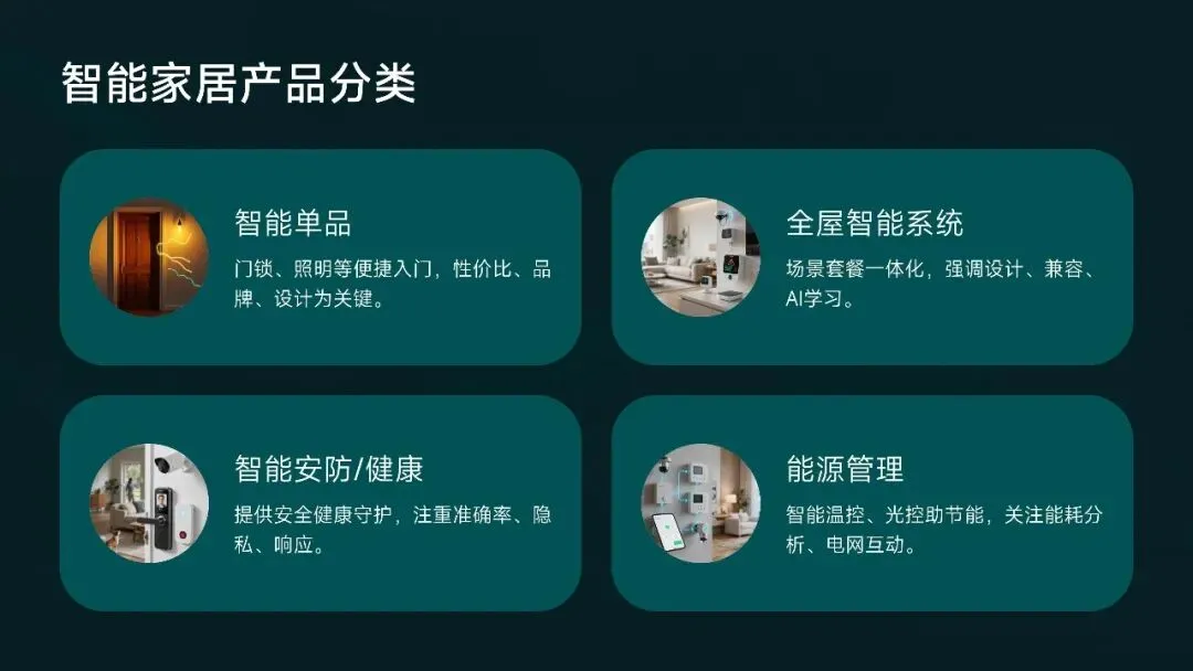 智能单品(门锁、照明、音箱等) | 便捷入门,单点功能升级 | 性价比、品牌口碑、设计美学 |