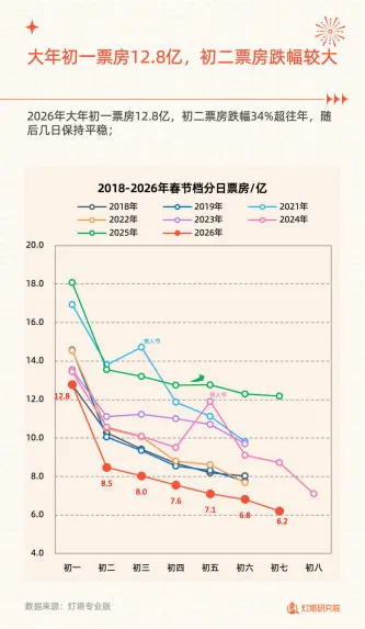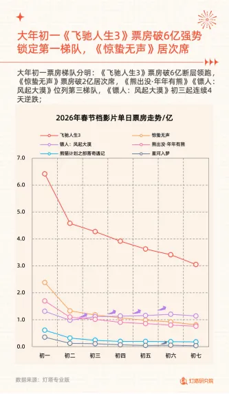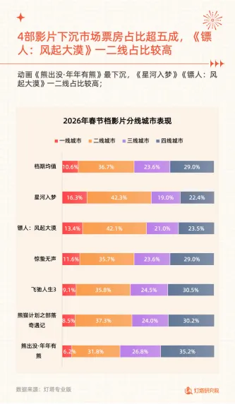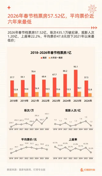 2026年春节档电影市场票房达57.52亿,场次435.1万创纪录,平均票价47.8元为2021年以来最低,观影人次1.20亿,上座率22.2%。档期票房走势呈现初一12.8亿开局后初二跌幅超往年,后续趋于平稳的特点,大年初一新片预售近6亿,映前2天因《飞驰人生3》预售增速显著。市场下沉趋势持续强化,三四线城市票房占比52.6%,成为票房核心贡献板块。
