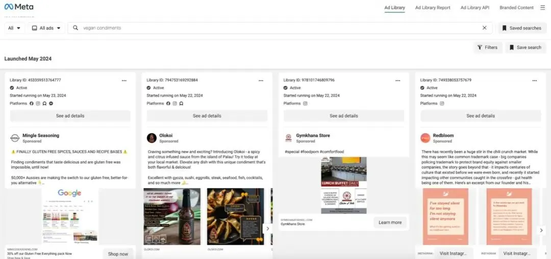 除Meta商务套件(Meta Business Suite)外,查看Meta广告资料库也很有帮助。利用这个免费的市场调研工具,你可以了解其他广告商的广告投放情况,并从中汲取广告灵感。