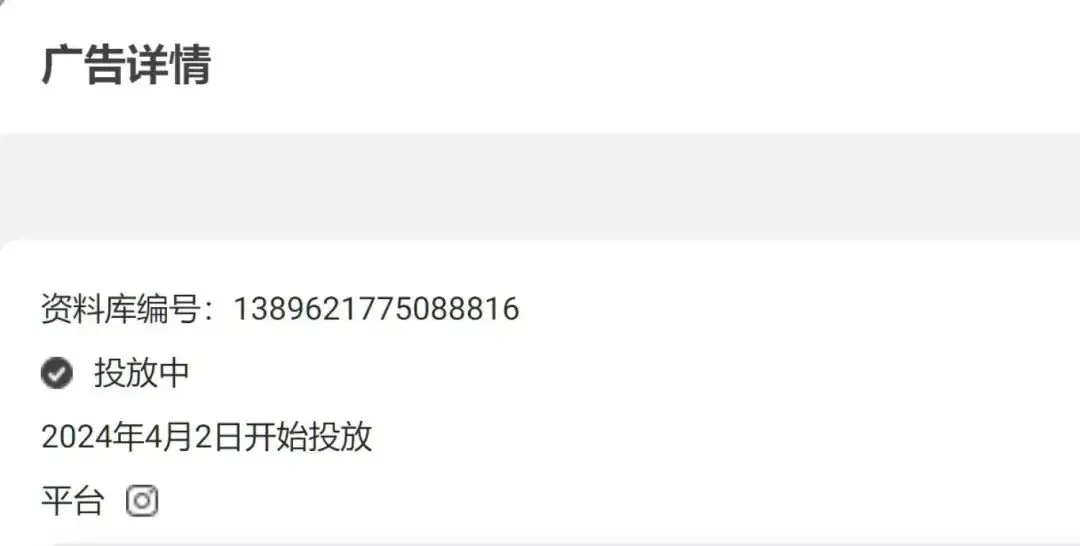 在浏览Meta广告资料库时,可以查看每个广告的类型和投放平台。查看广告创意上方显示的广告详细信息:包括广告的投放状态、投放日期以及已投放的平台列表。(广告资料库使用各种图标来显示广告投放平台)。