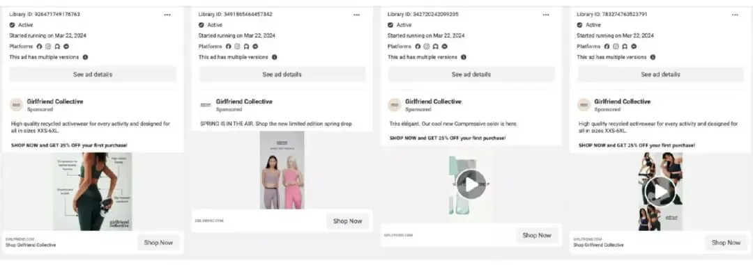 例如,可持续服装品牌Girlfriend Collective在其Facebook广告中除了使用静态图片外,还使用了Facebook视频广告。