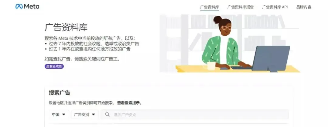 Meta广告资料库是一个可检索的数字化数据库,包含当前在Facebook、Instagram、WhatsApp和其他Meta平台上投放的广告信息。你可以在Meta广告资料库中搜索与你所在行业相关的广告类别,包括搜索竞争对手的广告和品牌合作内容。无论社会政治议题和选举相关的广告当前是否在投放中,它们均会在数据库中显示。
