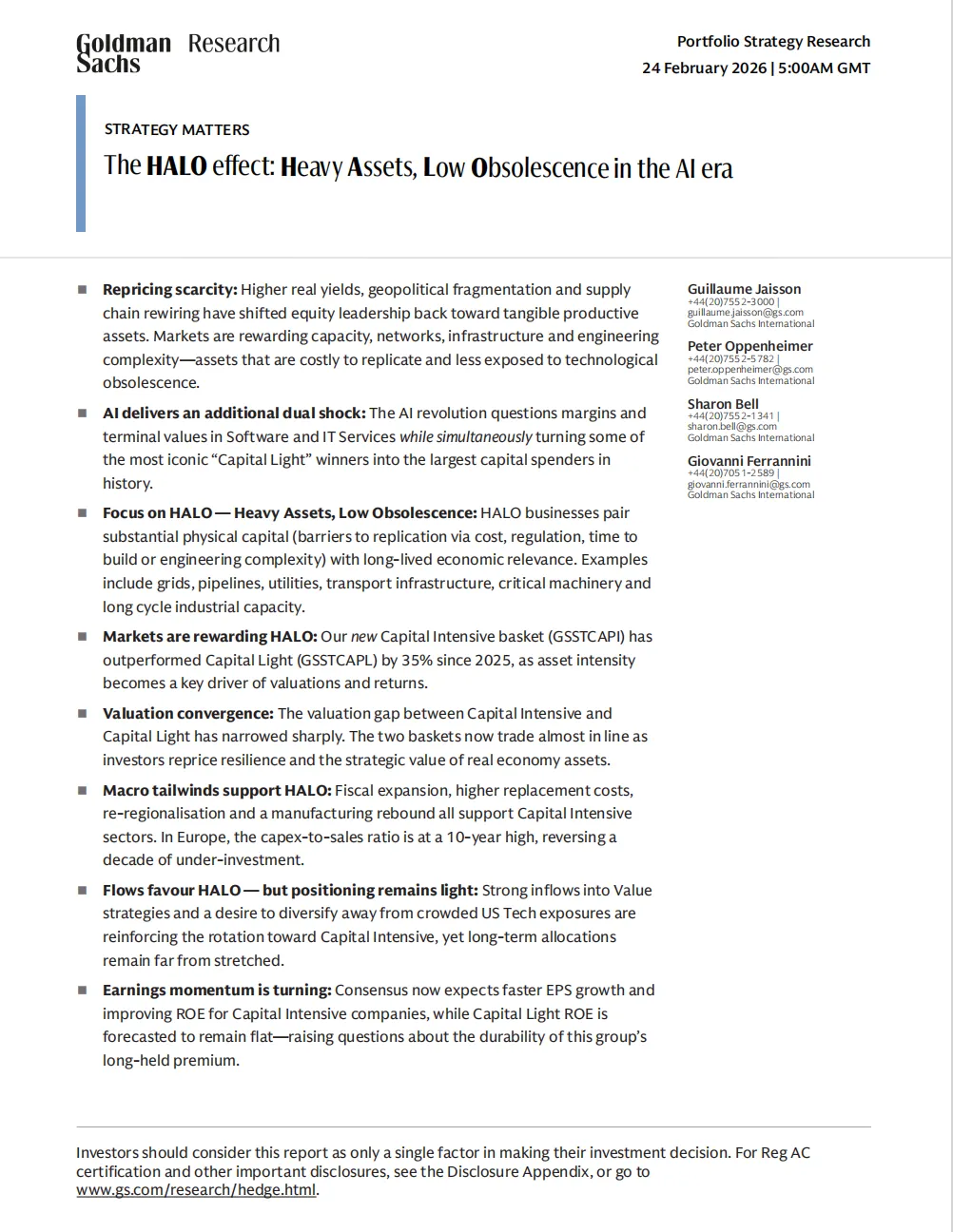 HALO这个概念引起了我的好奇,没几天高盛(Goldman Sachs)发布的投资策略报告也出来了,详细解释了HALO,并且讲了一个很清晰的投资主线转变: