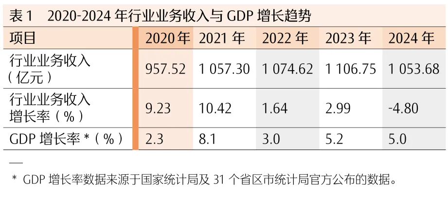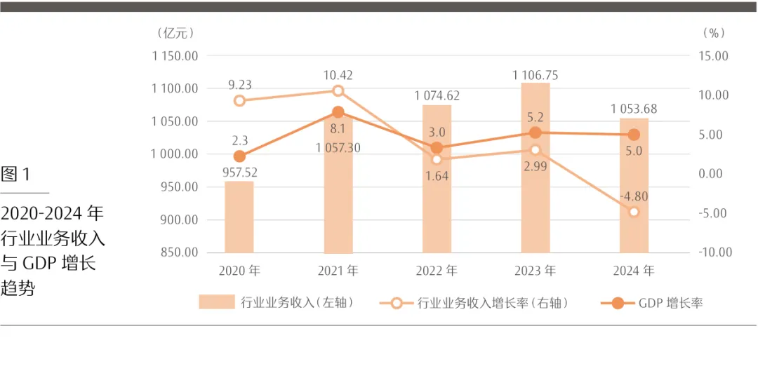 2024年,注册会计师行业实现业务收入1053.68亿元,较2023年减少53.07亿元,同比减少4.8%,行业业务收入总规模呈现下降态势,低于同期国内生产总值(GDP)增长率5%。详见表1和图1。
