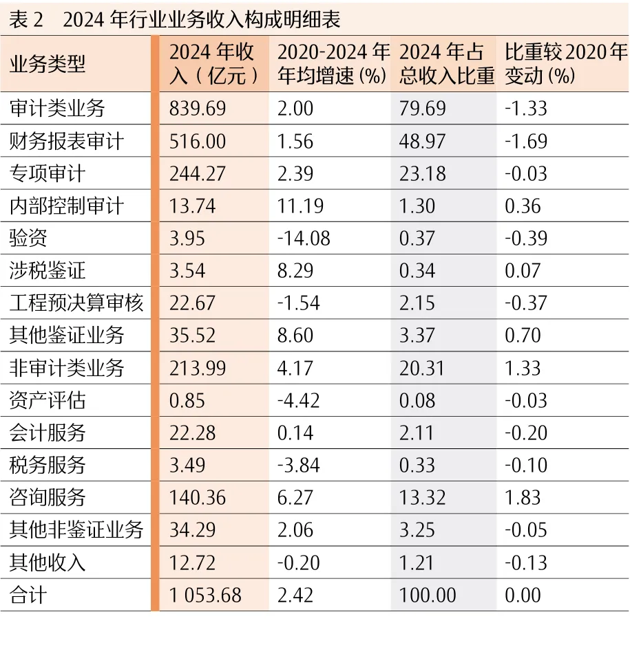 2020—2024年,行业审计类业务收入年均增长2%,非审计类业务收入年均增长4.17%。近5年,审计类与非审计类业务占行业总收入的比重此减彼增,非审计类业务占比为20%,虽持续提升,但在行业总收入中占比仍然偏低。审计类业务中,内部控制审计、涉税鉴证、其他鉴证业务收入年均增速高于行业平均水平(2.42%),验资和工程预决算审核收入为负增长。传统财务报表审计收入年均增速为1.56%,在行业总收入中仍处于主导地位,2024年末占比达48.97%。非审计类业务中,咨询服务收入年均增速高于行业平均水平,资产评估、税务服务和其他收入2年均增速均为负值(见表2)。(2.主要包括总所或地方注协向事务所拨付的扶持补贴或事务所之间发生的协作收入等。)