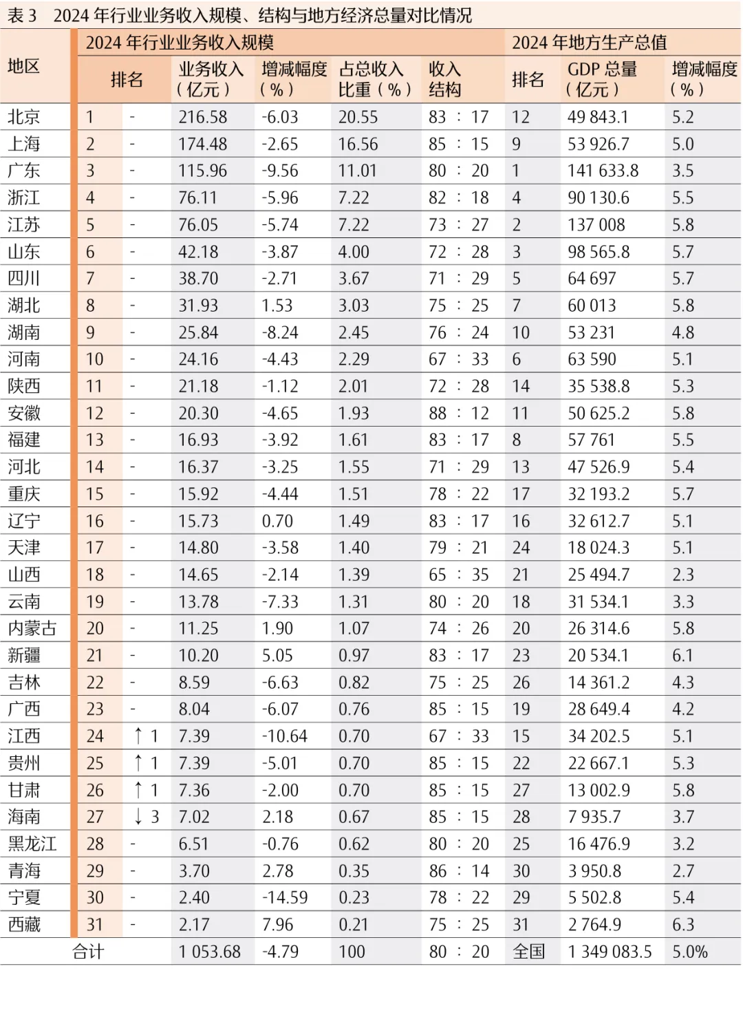 2.各地区业务收入情况。2024年,业务收入排名前10位的地区业务收入规模均超过24亿元,收入总量占行业总收入的78%,与2023年(78.44%)相比略有下降。其中,北京以业务收入216.58亿元蝉联第1位;上海(174.48亿元)位列第2位;广东(115.96亿元)继续位列第3位;浙江、江苏、山东、四川、湖北、湖南和河南分别位列第4-10位。2024年,江西、贵州、甘肃、海南等4个地区的业务收入排名较上年有所变化。其中,江西(第24位)上升1位,贵州(第25位)上升1位,甘肃(第26位)上升1位,海南(第27位)下降3位。纵观2020-2024年,排名前10位的地区比较稳定,分别为北京、上海、广东、浙江、江苏、山东、四川、湖北、湖南和河南。从业务收入结构看,2024年,全国31个地区中,审计类与非审计类业务收入比例高于行业平均水平(80∶20)的有15个地区,地区数量比2023年(16个)减少1个。其中,江苏、山东、四川、湖北、河南、陕西、河北、山西、内蒙古、吉林、江西、西藏等12个地区的非审计类业务收入占全省业务收入的25%以上,相较于上年,除四川(持平)和西藏(下降)外,其他10个地区的业务收入结构进一步优化(见表3)。