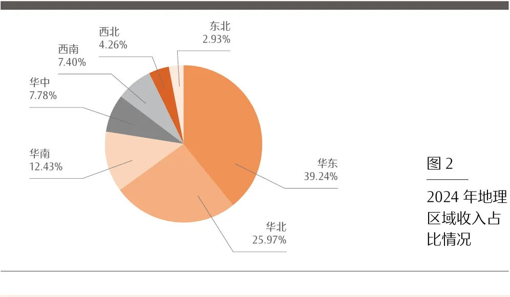 从区域划分看,2024年,华东和华北地区的业务收入总量占全国总收入的65.21%,继续延续绝对优势地位。其中,华东地区占39.24%,华北地区占25.97%。华南、西南和华中地区占比分别为12.43%、7.40%和7.78%。西北和东北地区合计占比7.19%,相比2023年(6.85%)有所增长(见图2)。