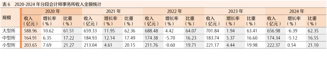 3.不同规模会计师事务所(总所合计)业务收入情况。从不同规模会计师事务所的收入总额看,大型会计师事务所(业务收入超过1亿元)的业务总收入由2020年的588.96亿元变为2024年的656.97亿元,年均增速约为2.77%,占总收入比重较2020年增长0.84%;中型会计师事务所(业务收入在1000万元至1亿元)的业务总收入由2020年的164.91亿元变为2024年的174.34亿元,年均增速约为1.4%,占总收入比重较2020年下降0.67%;小型会计师事务所(业务收入在1000万元以下)的业务总收入由2020年的203.65亿元变为2024年的222.37亿元,年均增速约为2.22%,占总收入比重较2020年下降0.17%(见表6)。