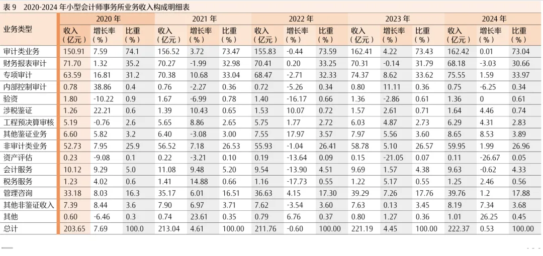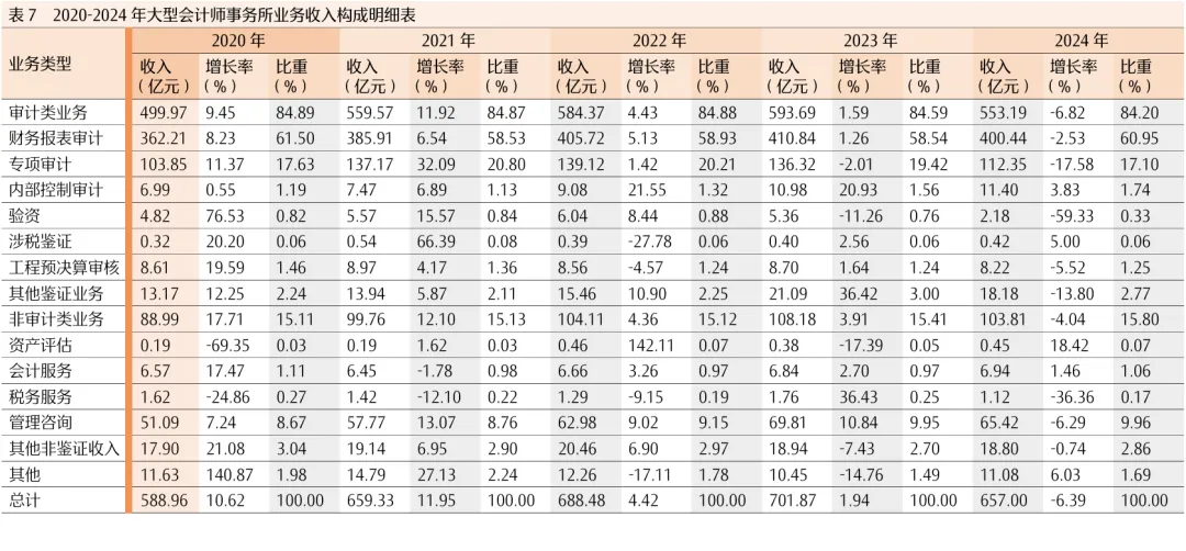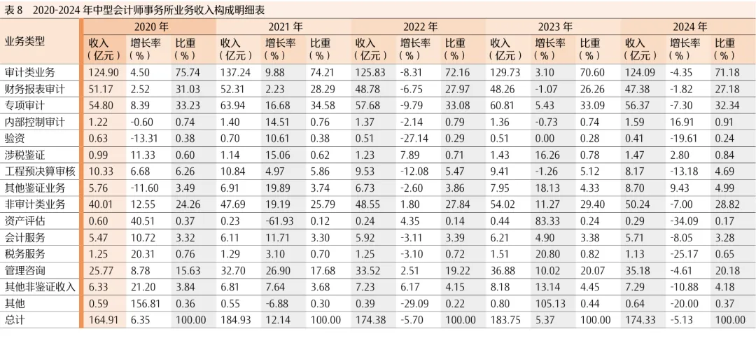 2024年,大型会计师事务所审计类和非审计业务收入增速较2020-2023年均为下降;中型会计师事务所审计类收入由上年正增长转为负增长,小型会计师事务所审计类收入增速近乎持平(见表7至表9)。