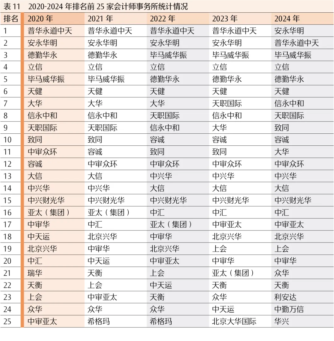 从2020-2024年排名前25家会计师事务所的统计情况来看,整体呈现出一定的稳定性与波动性。在头部事务所中,普华永道中天、安永华明、毕马威华振、立信、德勤华永、天健等长期稳居前10名。其中,普华永道中天在2020-2023年连续四年位居榜首,2024年则降至第2名,安永华明在2024年上升至第1名,头部前两名的位置发生了互换,竞争较为激烈。排序变化方面,部分事务所的波动较为明显。信永中和从2020年的第8名逐步上升至2024年的第7名;容诚从2020年的第12名上升至2022-2024年的第10名;大华2020-2022年稳居第7名,2023年降至第9名,2024年又降至第11名。还有一些事务所的排序存在阶段性变化,如中兴华、大信、中兴财光华等在13-15名左右波动,保持相对稳定的位置。中汇从2020年的第20名逐步上升至2022-2024年的第16名,发展态势良好。此外,部分事务所如利安达、中勤万信、华兴等在2024年进入前25名,替代了之前的一些事务所,反映出行业内竞争的动态变化(见表11)。