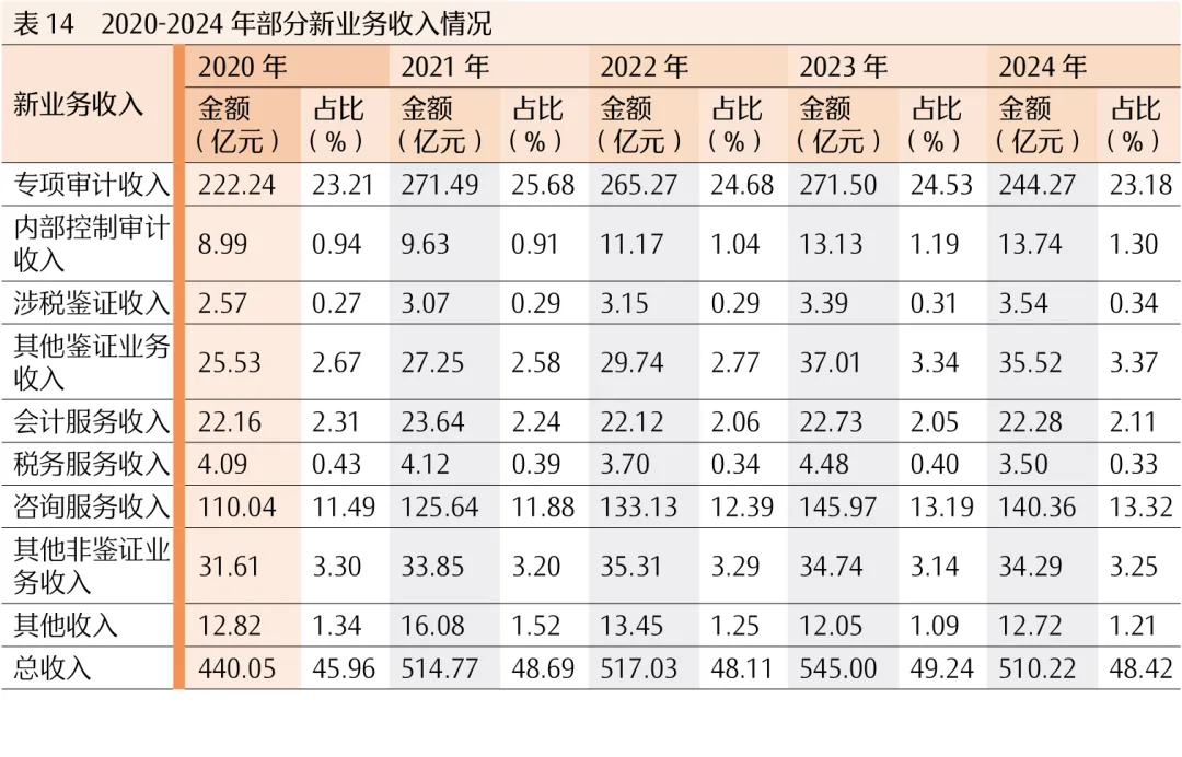 1.会计师事务所非财务报表审计业务收入规模持续增长。行业新业务服务范围主要包含专项审计、内部控制审计、涉税鉴证、其他鉴证业务、会计服务、税务服务、咨询服务、其他非鉴证业务和其他业务等。2024年,以上业务收入合计510.22亿元,较上年减少34.78亿元,同比下降6.38%,占行业总收入的48.42%。从结构变动情况看,2024年专项审计收入为244.27亿元,占行业总收入的23.18%,规模及占比均较上年有所回落;税务服务收入3.5亿元,占行业总收入的0.33%,亦呈下降趋势。与此同时,内部控制审计、涉税鉴证、其他收入等业务收入均实现规模与占比双提升,反映出行业在巩固传统业务的同时,多元化服务布局持续拓展(见表14)。