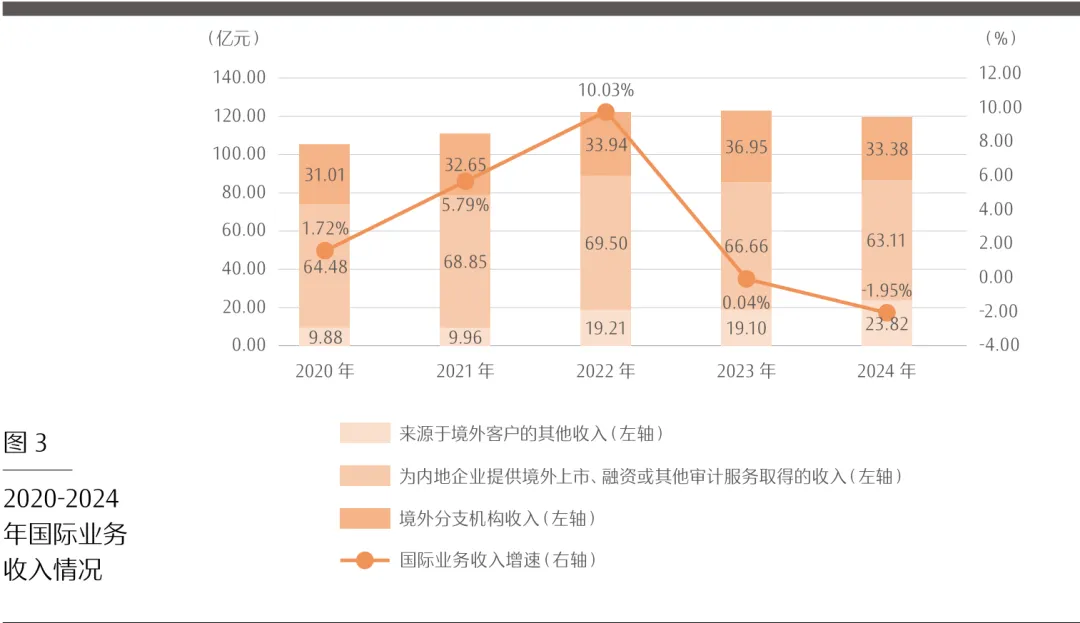 2.会计师事务所国际业务收入下降。2024年,行业创造国际业务收入120.31亿元,较上年下降2.39亿元。其中,为内地企业提供境外上市、融资或其他审计服务取得的收入63.11亿元,占行业国际业务收入的52.46%;来源于境外客户的其他收入33.38亿元,占行业国际业务收入的27.74%;境外分支机构收入23.82亿元,占行业国际业务收入的19.8%。从结构上看,内地企业仍是国际业务收入的最大来源;来源于境外客户的其他收入与境外分支机构收入合计占比同比增加1.87个百分点,表明行业多元化布局拓展,积极争取境外新客户,新设或自建海外网络,国际化发展取得成效(见图3)。