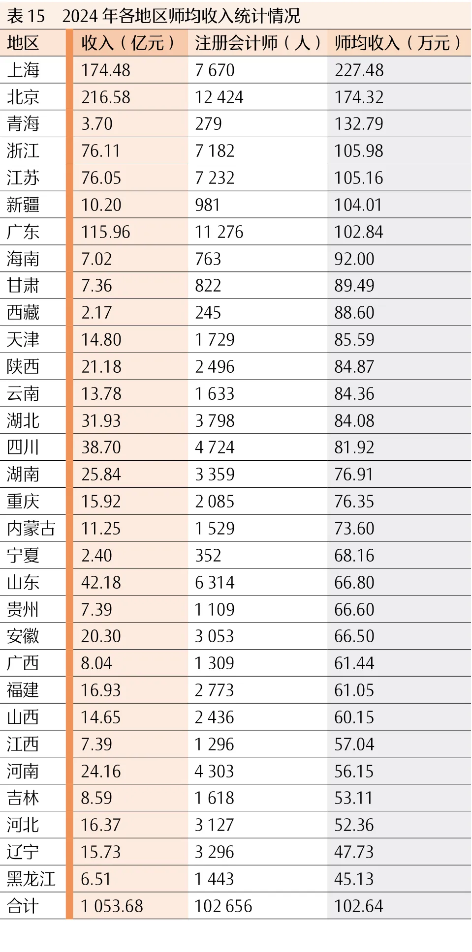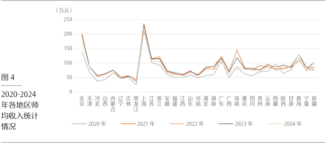 3.师均收入地区分化明显。2024年,全国31个地区师均收入格局总体平稳。上海227.48万元、北京174.32万元、青海132.79万元,继续居前三。甘肃89.49万元、西藏88.6万元,各上升5位,分列第九、第十,主要因收入增幅高于注册会计师人数增幅;新疆104.01万元升至第六,广东102.84万元降至第七,海南92万元降至第八,均受注册会计师人数增加影响。东北三省师均收入位于末位区间,与全国师均收入相比仍有显著落差。2020-2024年,上海、北京、浙江、江苏、广东、青海六地区始终位列前十,集中度较高(见表15和图4)。