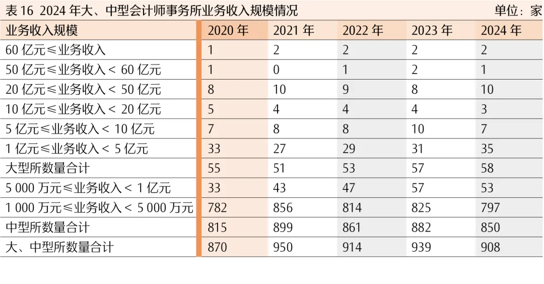 4.大、中型会计师事务所收入规模稳步上升。2024年,大、中型会计师事务所合计908家,较上年减少31家,占年末会计师事务所总数的9.54%,业务收入831.32亿元,同比下降6.13%,占行业总收入的78.9%,比重较上年下降1.11个百分点。其中,业务收入超过60亿元的会计师事务所2家;业务收入超过20亿元、低于60亿元的会计师事务所11家,较上年增加1家;业务收入超过5亿元、低于20亿元的会计师事务所有10家,较上年减少4家;业务收入超过1亿元、低于5亿元的会计师事务所有35家,较上年增加4家;业务收入超过5000万元、低于1亿元的会计师事务所有53家,较上年减少4家;业务收入超过1000万元、低于5000万元的会计师事务所有797家,较上年减少28家。总体来看,大、中型会计师事务所数量下降,中型会计师事务所数量收缩明显,资源向大型会计师事务所集中(见表16)。