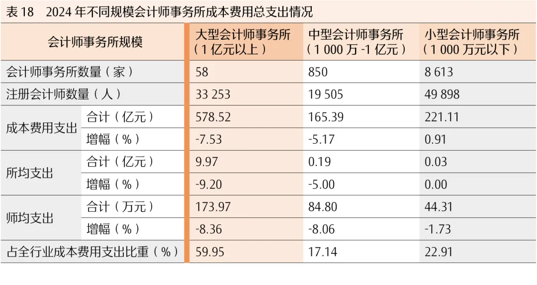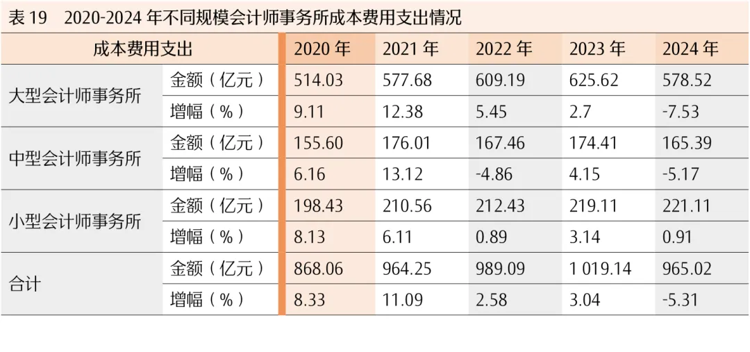 2024年,全国会计师事务所(总所合计)的成本费用总支出合计965.02亿元,较上年降低54.12亿元,同比下降5.31%。成本费用占业务收入的比重为91.59%,较上年下降0.49个百分点。大、中、小型会计师事务所对比情况见表18和表19。