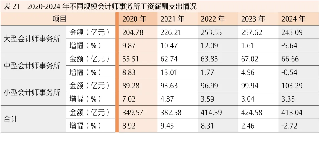 2024年,行业工资薪酬支出合计413.04亿元,较上年下降11.54亿元,占行业成本费用总支出的42.8%,较上年相比上升1.14个百分点。由于行业所处现代服务业的特点,人工成本中的工资薪酬支出成为行业最大支出。其中,大型会计师事务所和中型会计师事务所的工资薪酬支出分别为243.09亿元和66.66亿元,降速分别为5.64%和0.54%,小型会计师事务所的工资薪酬支出为103.29亿元,增速为3.35%。大型会计师事务所师均支出73.1万元,中型会计师事务所师均支出34.18万元,相对上年均有小幅下跌,小型会计师事务所师均支出20.70万元,相对上年略有增加(见表20和表21)。