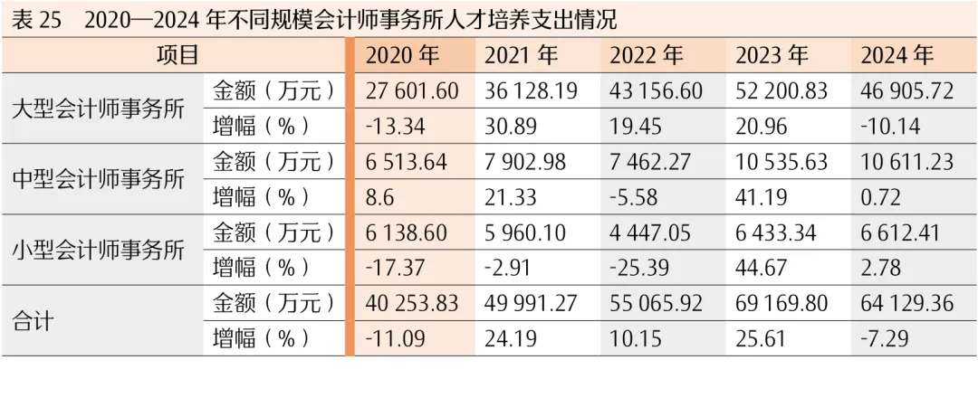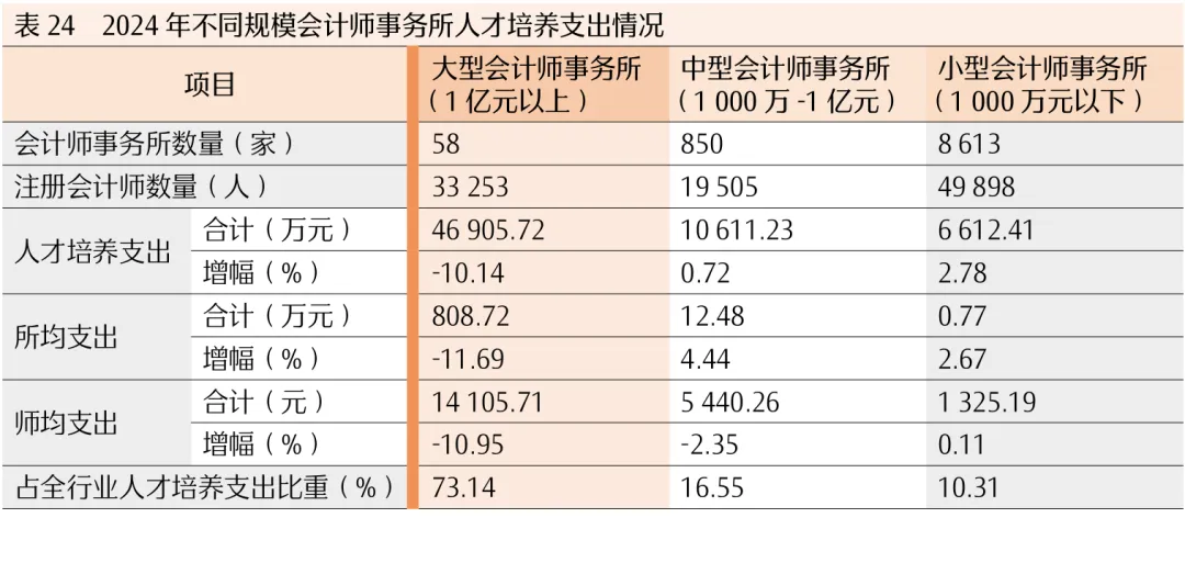 2024年,大型会计师事务所的人才培养支出46905.72万元,占行业人才培养支出总额的73.14%,所均支出808.72万元,师均支出14105.71元;中型会计师事务所的人才培养支出10611.23万元,占行业人才培养支出总额的16.55%,所均支出12.48万元,师均支出5440.26元;小型会计师事务所的人才培养支出6612.41万元,占行业人才培养支出总额的10.31%,所均支出0.77万元,师均支出1325.19元。数据表明,一是大型会计师事务所的人才培养支出较2023年有一定下降,中、小型会计师事务所人才培养支出保持增长趋势;二是会计师事务所规模越大,人才培养所均支出金额绝对值越高,但就行业人才培养支出的绝对数来看,人才培养支出占行业成本费用总支出的比重仍然不高(见表24和表25)。
