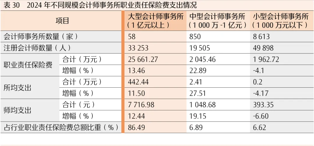 2024年,会计师事务所职业责任保险费支出合计2.97亿元,较上年增加0.33亿元,增长率为12.69%。其中,大型会计师事务所支出2.57亿元,同比上升13.46%,所均支出442.44万元,占行业职业责任保险费支出总额的86.49%;中型会计师事务所支出2045.46万元,同比上升22.89%,所均支出2.41万元,占行业职业责任保险费支出总额的6.89%;小型会计师事务所支出1962.72万元,同比下降4.1%,所均支出0.2万元,占行业职业责任保险费支出总额的6.62%,大型和中型会计师事务所职业责任保险费支出大幅增长,幅度高于行业水平(见表30和表31)。从地区看,上海、北京地区的会计师事务所职业责任保险费支出金额约占全行业职业责任保险费总额的68.94%。其中,上海占40.72%(1.2亿元),北京占28.22%(0.83亿元)。全国31个地区中,黑龙江(8.57万元)和宁夏(3.49万元)地区会计师事务所职业责任保险费支出金额不足10万元。