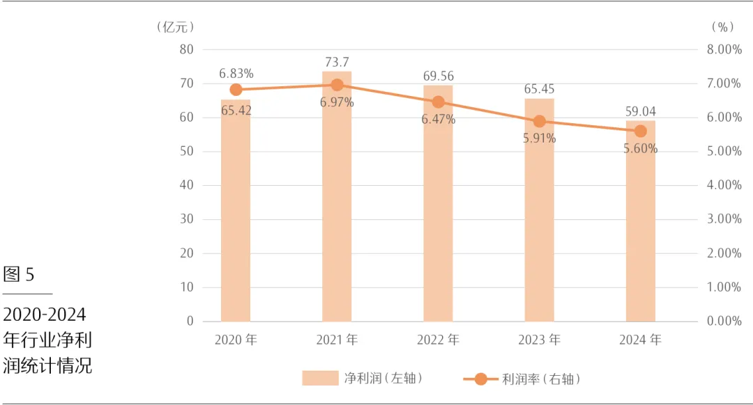 1.盈利能力略有下降。2024年全行业实现净利润59.04亿元,较上年减少6.41亿元,同比下降9.79%。业务收入利润率5.6%,较上年减少0.31个百分点,行业盈利能力在2020-2021年保持稳中有升趋势后发生逆转,2022-2024年持续下降(见图5)。