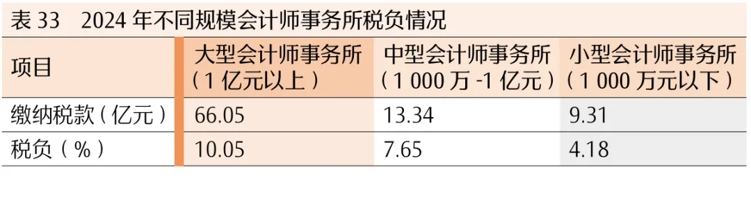 2.大型会计师事务所盈利能力处于行业领先水平。从利润率来看,2024年大、中、小型会计师事务所盈利水平差距较大。其中,大型会计师事务所利润率为8.4%,中型会计师事务所利润率为3.44%,小型会计师事务所利润率为-0.96%,中、小型会计师事务所盈利水平均低于行业平均水平(5.6%)。从大、中、小型会计师事务所的净利润来看,大型会计师事务所净利润合计55.18亿元,占全行业净利润的比重为93%(见表32)。