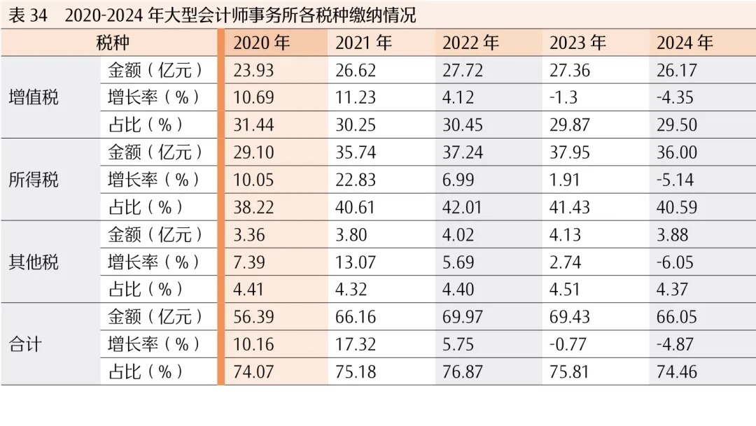 2.大型会计师事务所在行业纳税贡献中的占比降低,中型会计师事务所与去年持平,小型会计师事务所有所增加。其中,大型会计师事务所平均税负为10.05%,中型会计师事务所税负为7.65%,小型会计师事务所税负为4.18%,中小型会计师事务所税负低于行业平均水平(8.42%)。从大中小型会计师事务所的在行业纳税贡献中的占比来看,大型会计师事务所合计66.05亿元,占全行业纳税贡献的比重由上年的75.81%下降到74.46%,且包括增值税、所得税在内的主要税种纳税额占比均呈下降趋势,主要是大型会计师事务所收入增长放缓和下降所致(见表33)。