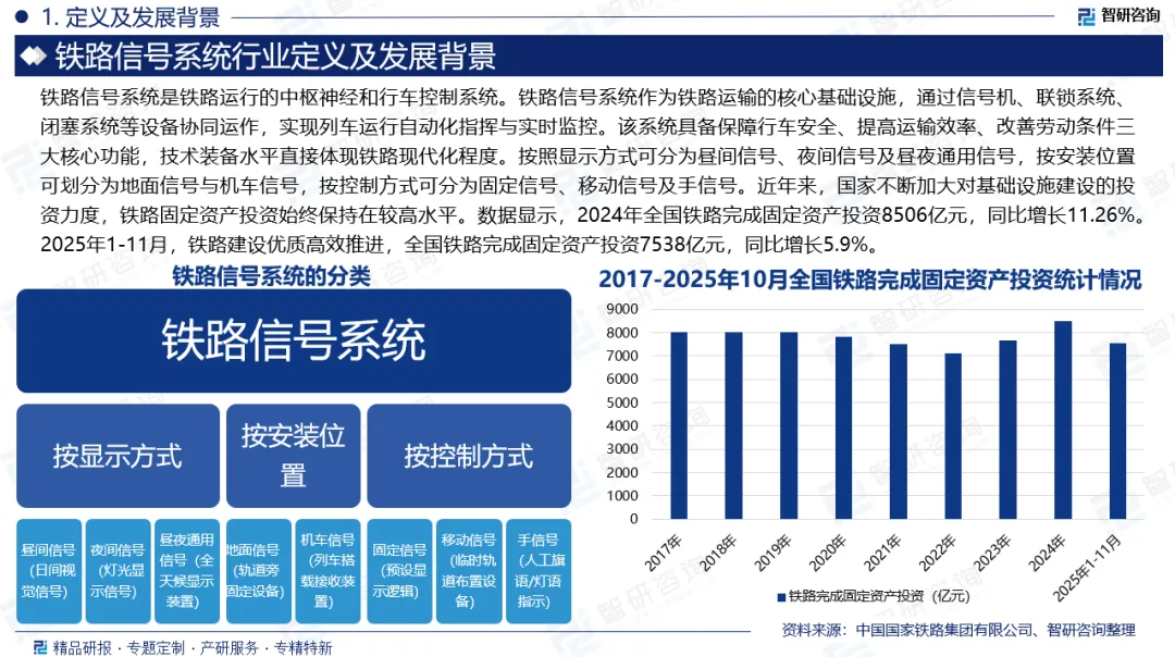 发展背景:我国经济持续稳定增长,为铁路建设提供了坚实的资金保障。近年来,国家不断加大对基础设施建设的投资力度,铁路固定资产投资始终保持在较高水平。数据显示,2024年全国铁路完成固定资产投资8506亿元,同比增长11.26%。2025年1-11月,铁路建设优质高效推进,全国铁路完成固定资产投资7538亿元,同比增长5.9%。有效发挥了对全社会投资的拉动作用,为经济社会高质量发展提供了有力支撑。随着我国新型城镇化进程的不断深入,城市群内部的城际铁路、市域(郊)铁路建设需求持续释放,为铁路信号系统行业带来了广阔的市场空间。