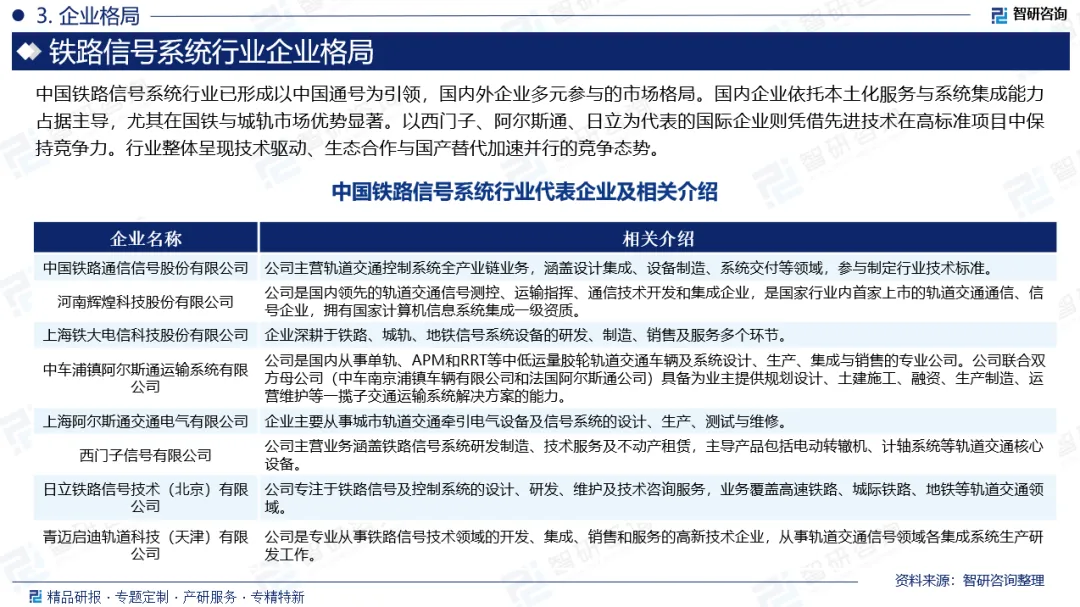 企业格局:中国铁路信号系统行业已形成以中国通号为引领,国内外企业多元参与的市场格局。国内企业依托本土化服务与系统集成能力占据主导,尤其在国铁与城轨市场优势显著。以西门子、阿尔斯通、日立为代表的国际企业则凭借先进技术在高标准项目中保持竞争力。行业整体呈现技术驱动、生态合作与国产替代加速并行的竞争态势。当前,中国铁路信号系统行业代表企业包括中国铁路通信信号股份有限公司、河南辉煌科技股份有限公司、上海铁大电信科技股份有限公司、中车浦镇阿尔斯通运输系统有限公司、上海阿尔斯通交通电气有限公司、西门子信号有限公司、日立铁路信号技术(北京)有限公司、青迈启迪轨道科技(天津)有限公司等。