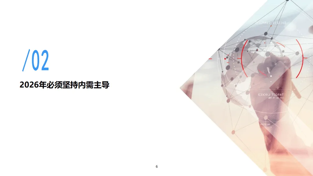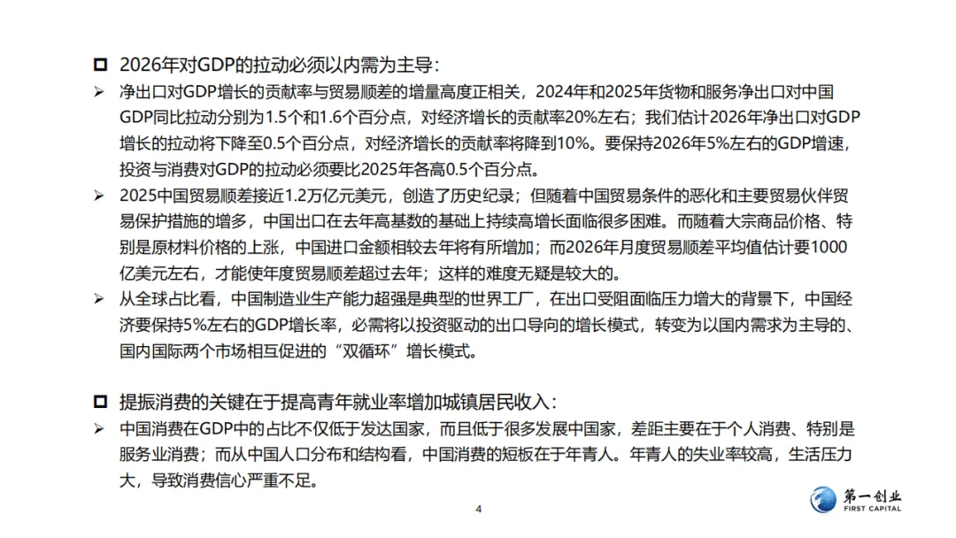 2026年中国经济要实现5%左右的GDP增速,需确立内需主导的发展模式,推动从出口导向型增长向“双循环”模式转型,同时分别从解决青年就业、走出通缩入手提振消费与投资,成为经济增长的核心动力。