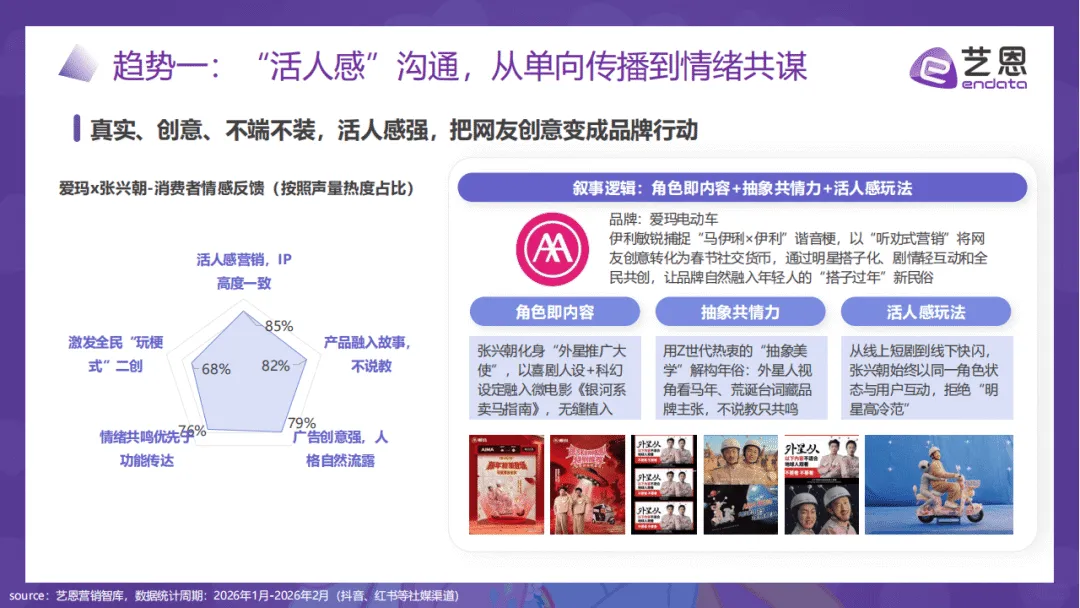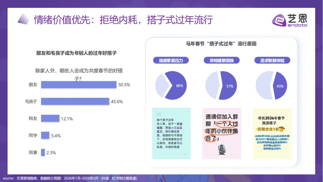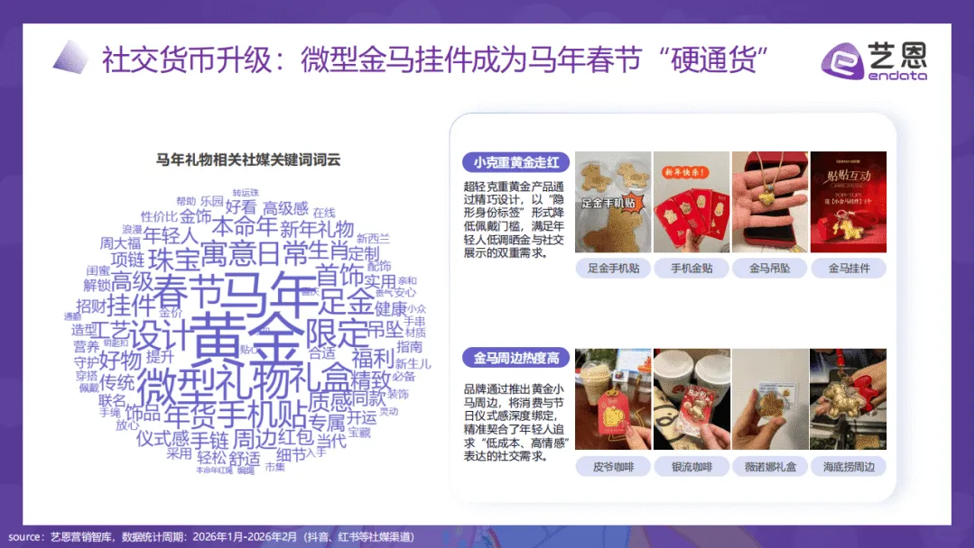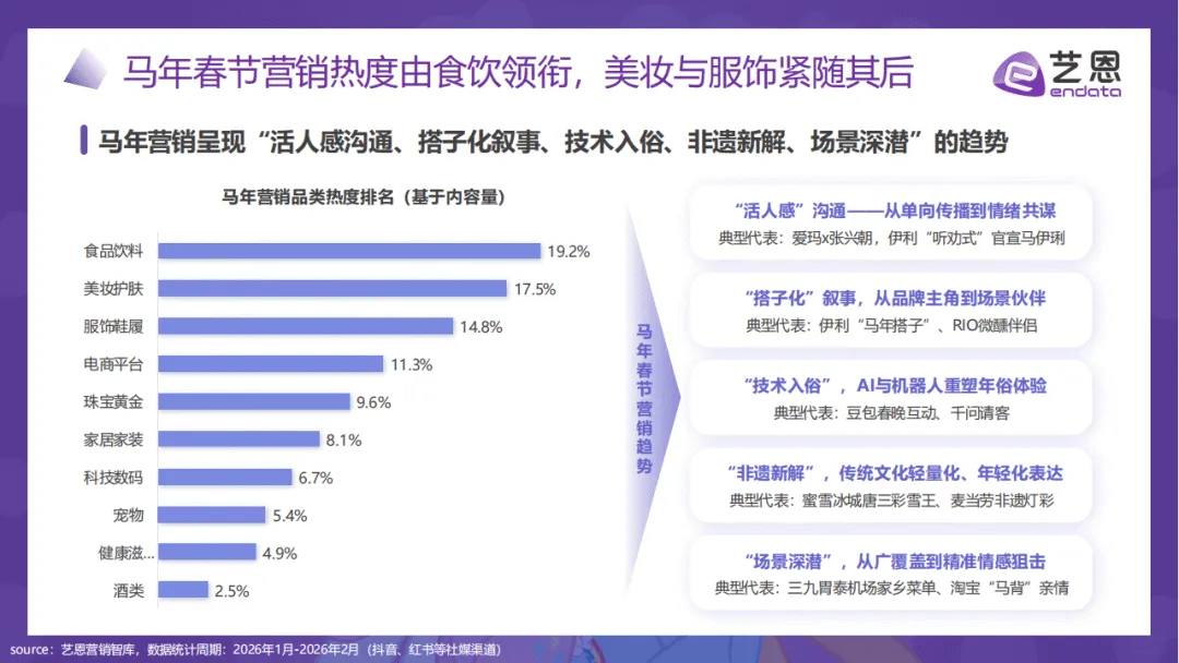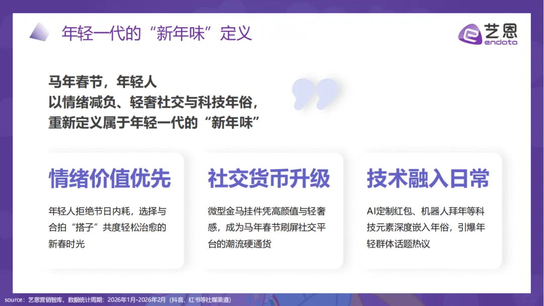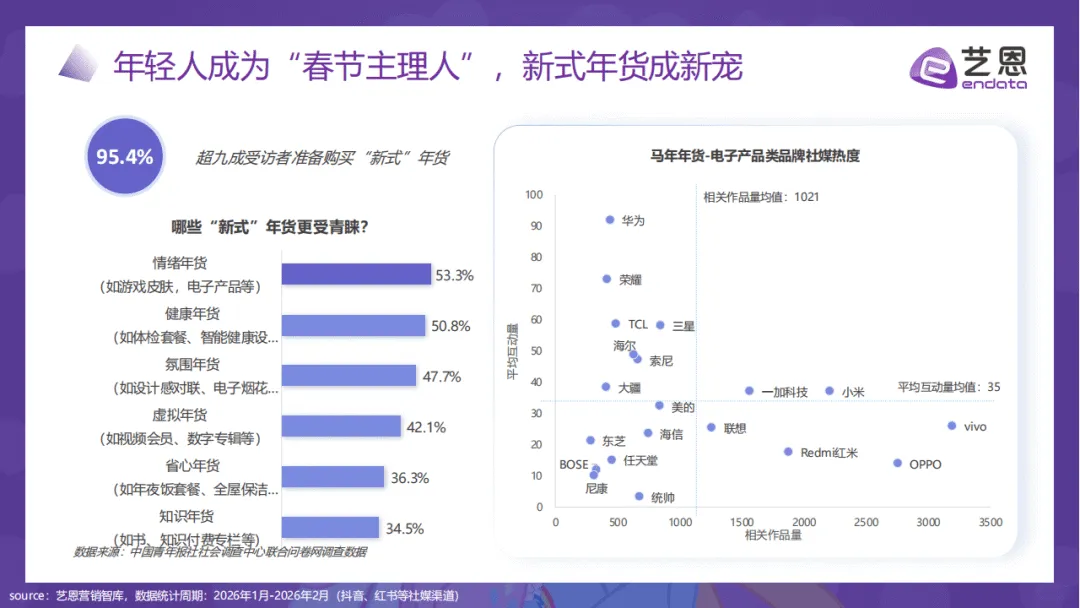 2026马年春节品牌营销围绕Z世代主导的新年味展开,以“情绪共谋”和“场景深潜”为核心,传统年俗被技术与创意重构,品牌营销呈现多元新趋势。本次春节社媒热度同比增长21.4%,非遗新玩、AI春节等成为热门方向,年轻人在不同平台形成差异化过年特征,小红书主打仪式感与生活策展,抖音侧重娱乐化与场景破圈,超九成受访者倾向购买新式年货,情绪、健康、氛围类年货最受青睐,电子产品类品牌也迎来社媒热度提升。