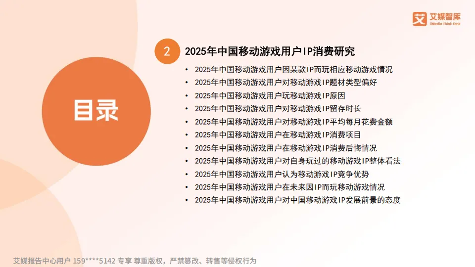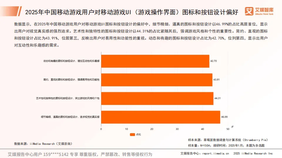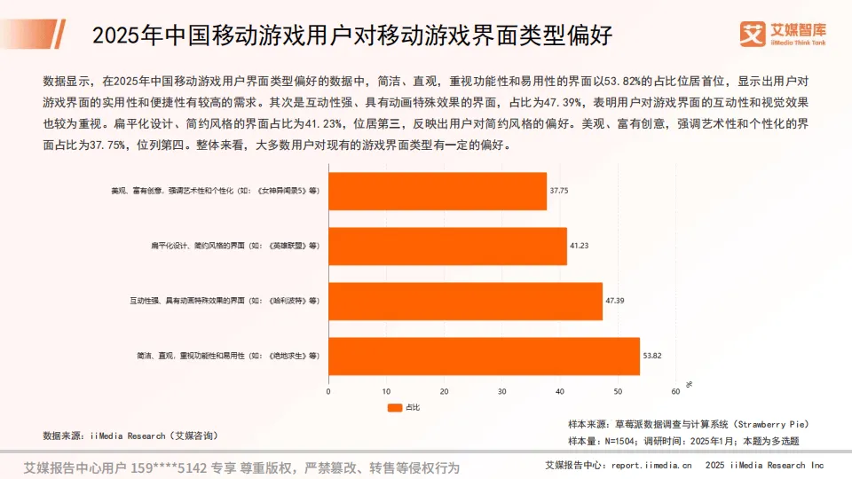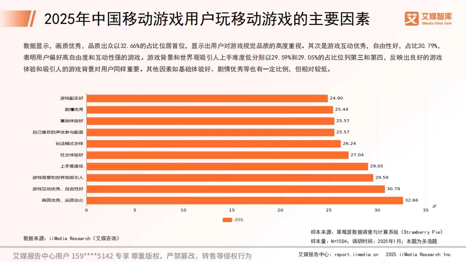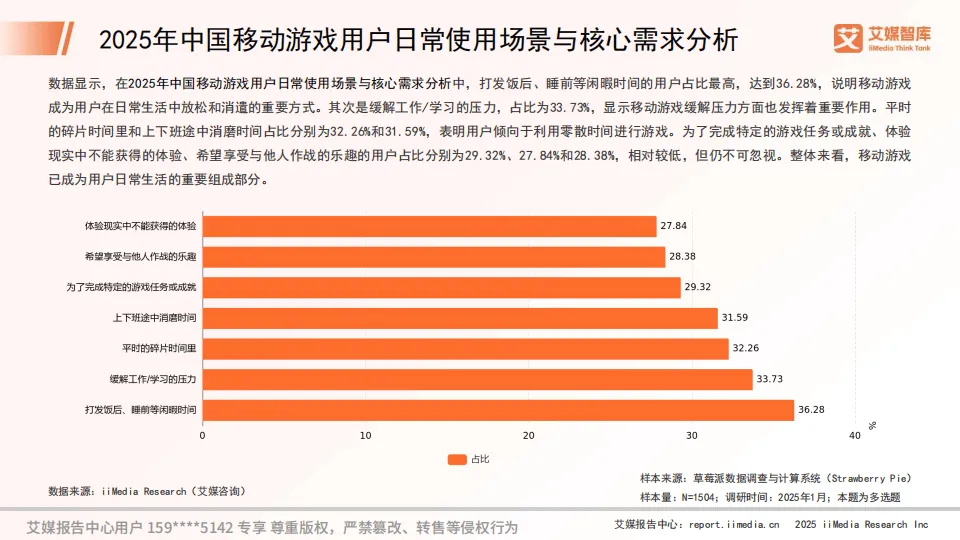 艾媒智库2025年中国移动游戏市场消费行为调查(样本量1504),从用户行为、IP消费、用户特征三大维度展现了行业现状,核心呈现出移动游戏市场用户需求偏向实用与优质体验、IP影响力显著但留存偏低、用户群体特征高度集中的特点。