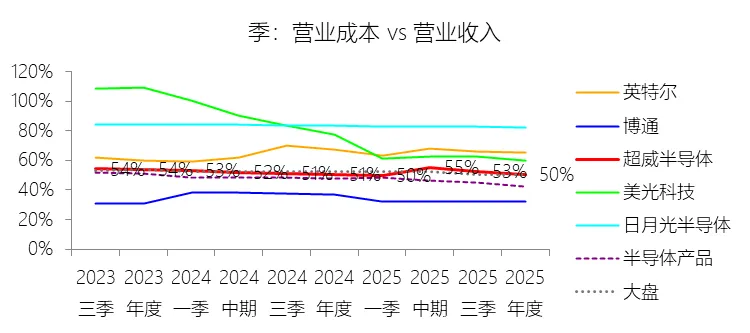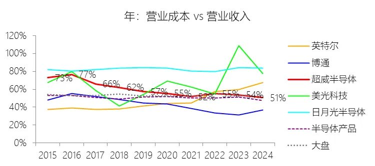 营业成本:2025年,超威半导体的营业成本为174.87亿美元,同比增长33.9%,与营业收入的比例为50.48%(营业成本率,即1-毛利率),同比下降0.17个百分点;2015-2024年(十年),此项合计为697.83亿美元,平均比例为55.81%,比半导体产品行业的均值高5.2个百分点,长期呈下降趋势。比例短期下降主要由于公司产品组合的持续优化,特别是高毛利率的数据中心业务以及客户端及游戏业务在2025年营收增长强劲,使得毛利率提升至50%,尽管当期因美国政府对MI308 Data Center GPU产品的出口管制而录得约4.4亿美元的净库存及相关支出,但整体收入的增长速度(34.34%)仍略高于营业成本的增速(33.9%)。比例长期下降主要由于公司核心产品架构(如“Zen”系列)的成功执行,推动了业务重心从低利润产品向高性能服务器(EPYC)和高端PC(Ryzen)市场转移,极大提升了产品的平均售价与盈利能力;同时,通过收购赛灵思(Xilinx)等战略举措,显著增加了高利润率的嵌入式业务比例,并在业务规模扩张过程中通过规模效应有效降低了单位固定成本。比例高于半导体产品行业的均值主要由于公司在过去十年中有较大比例的收入来自半定制SoC业务(如索尼和微软的游戏机芯片),此类业务的毛利率通常低于行业平均水平,从而拉高了营业成本率;此外,作为采用代工模式的企业,AMD历史上受制于与GLOBALFOUNDRIES(GF)的晶圆供应协议(WSA),曾多次因修订协议、未能达到最低采购目标或支付技术转让费而产生巨额额外成本(如2016年因WSA修订录得3.4亿美元支出),且大规模并购产生的无形资产摊销和库存公允价值调整也对GAAP口径下的营业成本率产生了显著的压制作用。
