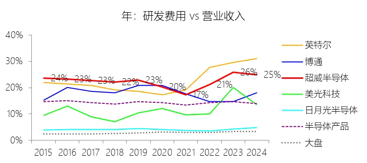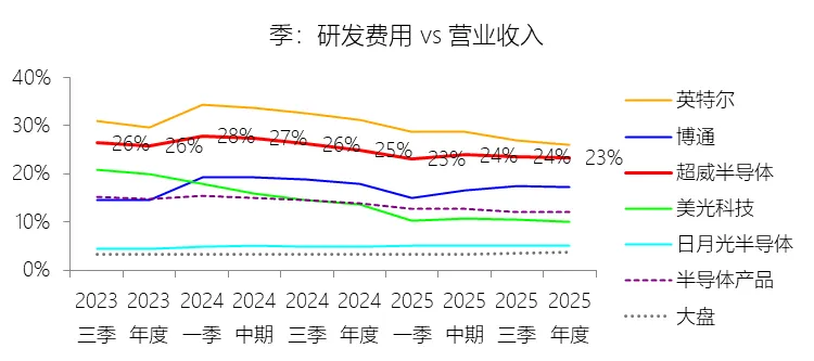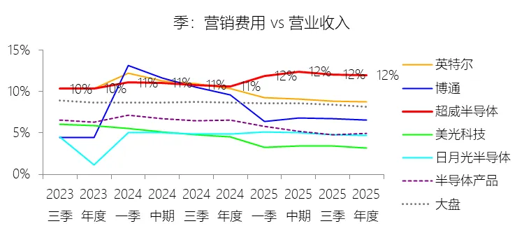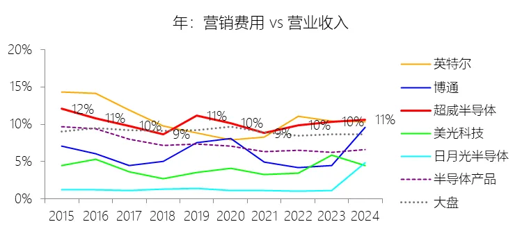 营销费用:2025年,超威半导体的营销费用为41.44亿美元,同比增长51.52%,与营业收入的比例为11.96%,同比上升1.36个百分点;2015-2024年(十年),此项合计为126.42亿美元,平均比例为10.11%,比半导体产品行业的均值高2.96个百分点,长期呈下降趋势。