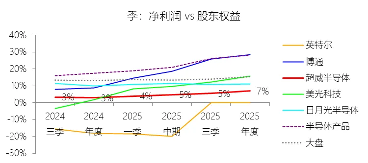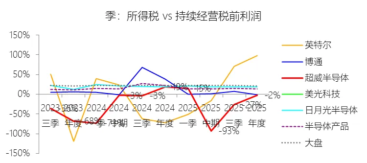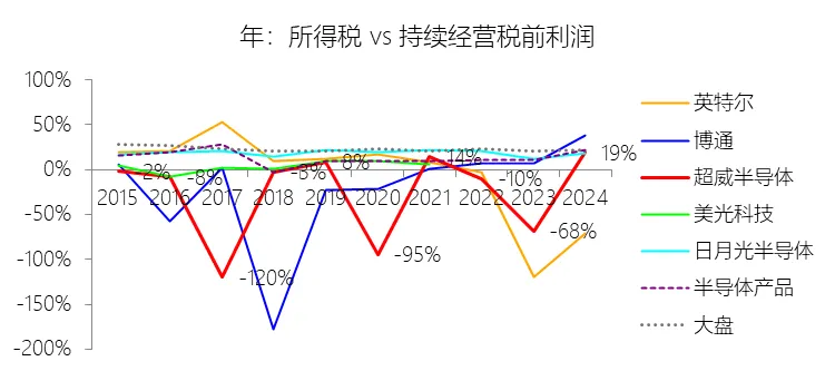 所得税率:2025年,超威半导体的所得税为-1.03亿美元,与持续经营税前利润的比例为-2.47%(所得税率),同比下降21.32个百分点;2015-2024年(十年),此项合计为-6.91亿美元,平均比例为-8.36%,比半导体产品行业的均值低21.27个百分点,长期呈上升趋势。