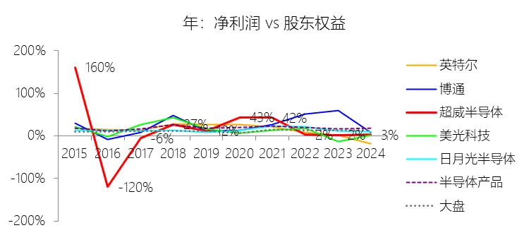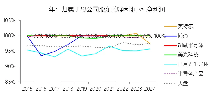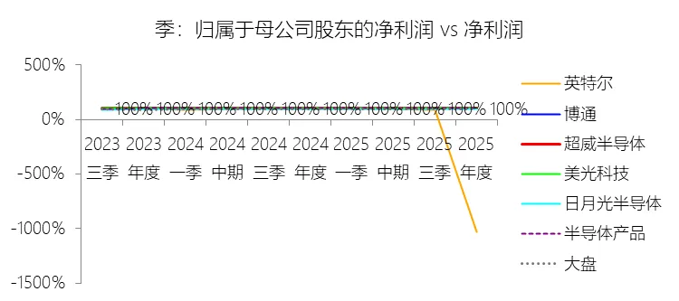 归属于母公司股东的净利润:2025年,超威半导体的归属于母公司股东的净利润为43.35亿美元,同比增长164.17%,与净利润的比例为100.00%,同比持平;2015-2024年(十年),此项合计为89.54亿美元,平均比例为100.00%,比半导体产品行业的均值高0.16个百分点,长期呈持平趋势。