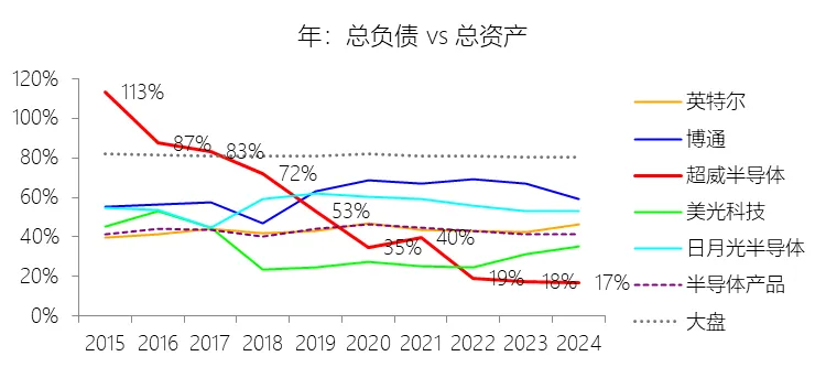 总资产增长率:2025年末,超威半导体的总资产为769.26亿美元,对比年初增长11.12%,增速同比(去年同期)上升9.15个百分点;2015-2024年(九年)增长2144.68%,年复合增长41.3%,比半导体产品行业的复合增速高26.66个百分点,长期呈上升趋势。增速短期上升主要由于公司在2025年完成了对ZT Systems的战略收购,虽然在同年10月将ZT制造业务出售给Sanmina,但通过保留核心的设计业务(ZT Design Business)及其知识产权与员工,显著增加了无形资产和商誉规模;同时,为支持第五代AMD EPYC处理器和AMD Instinct MI350系列GPU的强劲市场需求,公司在2025年大幅增加了先进工艺节点的库存储备,库存总额较年初增长38.12%至79.20亿美元;此外,得益于2025年强劲的盈利表现,现金、现金等价物及短期投资总额从2024年底的51亿美元跃升至106亿美元,为总资产提供了巨大的短期增量。增速长期上升主要由于公司成功执行了高性能产品路线图,实现了从2015-2016年经营困境到持续且扩大盈利的转型,带动了应收账款和存货等经营性资产随业务规模稳健扩张;关键性的转折点在于2022年完成了半导体史上规模最大的赛灵思(Xilinx)收购案(约488亿美元),使公司总资产从2021年底的124亿美元跨越式增长至2022年底的676亿美元;随后公司持续通过收购Pensando、Silo AI及ZT Systems等企业不断充实资产负债表中的技术与商誉资产;且2020年因盈利前景大幅改善而释放的13亿美元递延所得税资产也为资产长期增长做出了贡献。增速高于半导体产品行业的复合增速主要由于公司采取了更为激进的外延式增长战略,通过对赛灵思、ZT Systems等领军企业的战略并购,在极短时间内实现了在嵌入式、数据中心和AI基础设施等高增长市场的资产布局,其扩张规模远超行业有机的复合增速;公司在高性能计算和生成式AI爆发期占据了领先地位,使其数据中心相关资产的投入与回报循环显著快于行业平均水平;此外,公司长期维持极高的研发投入比例,将其转化为庞大的核心知识产权,使得总资产的增值潜力与抗风险能力均优于行业均值。