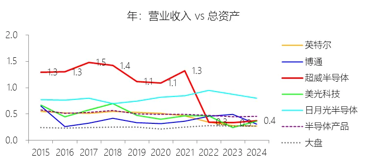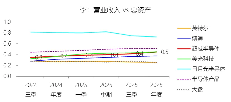 总资产周转率:2025年,超威半导体的总资产周转率为0.5次,同比上升0.08次;2015-2024年(十年),平均总资产周转率为0.5次,比半导体产品行业的均值高0.01次,长期呈下降趋势。